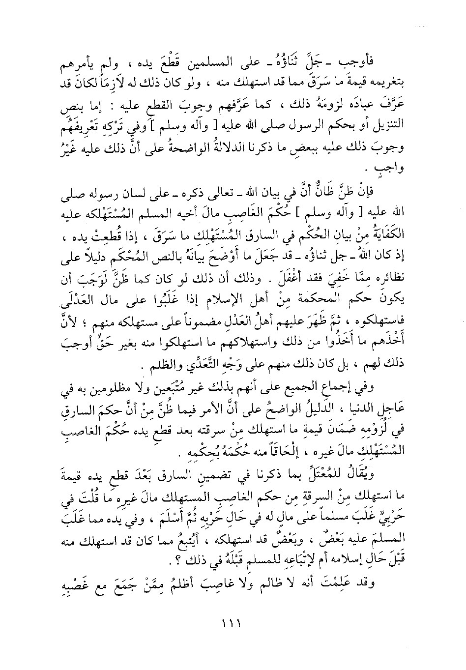 فَإِن ظن ظان أَن فِي بَيَان الله - تَعَالَى ذكره - على لِسَان رَسُوله - صَلَّى اللَّهُ عَلَيْهِ وَسَلَّم َ - حكم الْغَاصِب مَال أَخِيه الْمُسلم المستهلكه عَلَيْهِ الْكِفَايَة من بَيَان الحكم فِي السَّارِق الْمُسْتَهْلك مَا سرق، إِذا قطعت يَده، إِذْ كَانَ الله - جلّ ثَنَاؤُهُ - قد جعل مَا أوضح بَيَانه بِالنَّصِّ الْمُحكم دَلِيلا على نَظَائِره مِمَّا خَفِي فقد أغفل. وَذَلِكَ أَن ذَلِك لَو كَانَ كَمَا ظن لوَجَبَ أَن يكون حكم المحكمة من أهل الْإِسْلَام إِذا غلبوا على مَال العدلى فاستهلكوه، ثمَّ ظهر عَلَيْهِم أهل الْعدْل مَضْمُونا على مستهلكه مِنْهُم؛ لِأَن أَخذهم مَا أخذُوا من ذَلِك واستهلاكهم مَا استهلكوا مِنْهُ بِغَيْر حق أوجب ذَلِك لَهُم، بل كَانَ ذَلِك مِنْهُم على وَجه التَّعَدِّي وَالظُّلم.