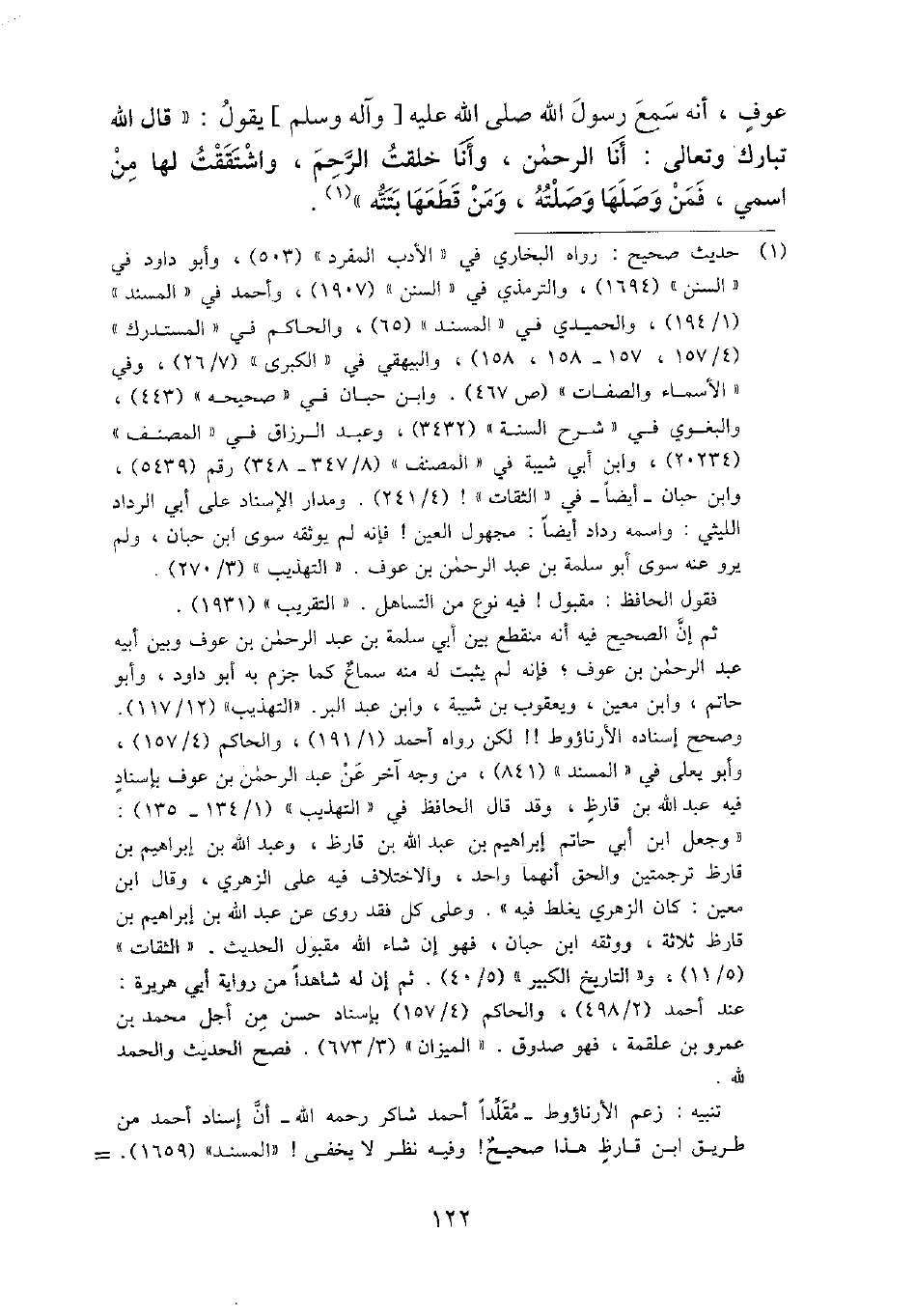 عَوْف، أَنه سمع رَسُول الله - صَلَّى اللَّهُ عَلَيْهِ وَسَلَّم َ - يَقُول: " قَالَ الله تبَارك وَتَعَالَى: أَنا الرَّحْمَن، وَأَنا خلقت الرَّحِم، واشتققت لَهَا من اسْمِي، فَمن وَصلهَا وصلته، وَمن قطعهَا بتته ".