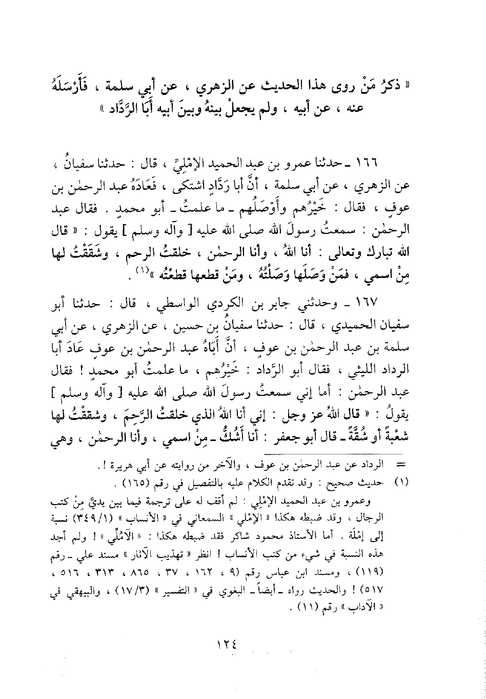 166 - حَدثنَا عَمْرو بن عبد الحميد الإملي قَالَ: حَدثنَا سُفْيَان، عَن الزُّهْرِيّ، عَن أبي سَلمَة، أَن أَبَا رداد اشْتَكَى، فعاده عبد الرَّحْمَن بن عَوْف، فَقَالَ: خَيرهمْ وأوصلهم - مَا علمت - أَبُو مُحَمَّد. فَقَالَ عبد الرَّحْمَن: سَمِعت رَسُول الله - صَلَّى اللَّهُ عَلَيْهِ وَسَلَّم َ - يَقُول: " قَالَ الله تبَارك وَتَعَالَى: أَنا الله، وَأَنا الرَّحْمَن، خلقت الرَّحِم، وشققت لَهَا من اسْمِي، فَمن وَصلهَا وصلته، وَمن قطعهَا قطعته ".