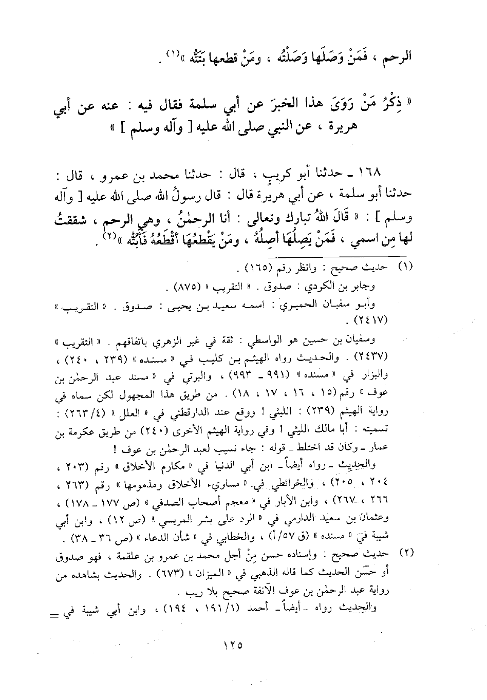 168 - حَدثنَا أَبُو كريب، قَالَ: حَدثنَا مُحَمَّد بن عَمْرو، قَالَ: حَدثنَا أَبُو سَلمَة، عَن أبي هُرَيْرَة قَالَ: قَالَ رَسُول الله - صَلَّى اللَّهُ عَلَيْهِ وَسَلَّم َ -: " قَالَ الله تبَارك وَتَعَالَى: أَنا الرَّحْمَن، وَهِي الرَّحِم، شققت لَهَا من اسْمِي، فَمن يصلها أَصله، وَمن يقطعهَا أقطعه فأبته ".