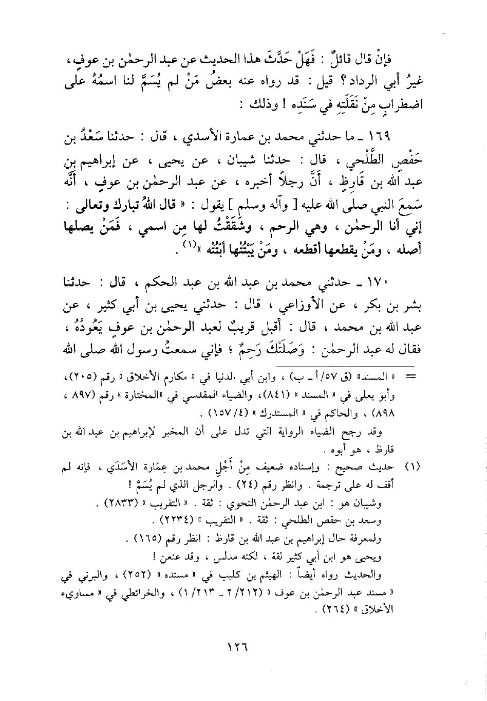 170 - حَدثنِي مُحَمَّد بن عبد الله بن عبد الحكم، قَالَ: حَدثنَا بشر بن بكر، عَن الْأَوْزَاعِيّ، قَالَ: حَدثنِي يحيى بن أبي كثير، عَن عبد الله بن مُحَمَّد، قَالَ: أقبل قريب لعبد الرَّحْمَن بن عَوْف يعودهُ، فَقَالَ لَهُ عبد الرَّحْمَن: وصلتك رحم؛ فَإِنِّي سَمِعت رَسُول الله - صَلَّى اللَّهُ عَلَيْهِ وَسَلَّم َ -