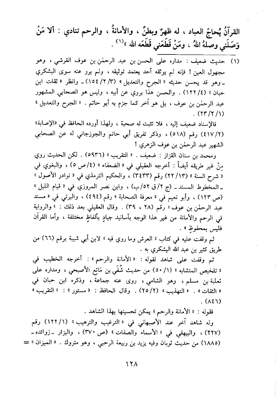 الْقُرْآن يحاج الْعباد، لَهُ ظهر وبطن، وَالْأَمَانَة، وَالرحم تنادي: أَلا من وصلني وَصله الله، وَمن قطعني قطعه الله ".