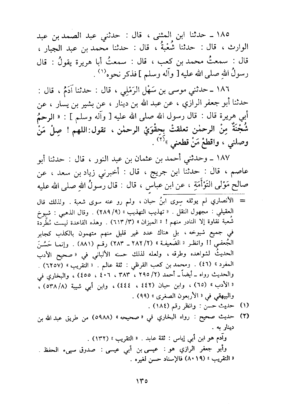 186 - حَدثنِي مُوسَى بن سهل الرَّمْلِيّ، قَالَ: حَدثنَا آدم، قَالَ: حَدثنَا أَبُو جَعْفَر الرَّازِيّ، عَن عبد الله بن دِينَار، عَن بشير بن يسَار، عَن أبي هُرَيْرَة قَالَ: قَالَ رَسُول الله - صَلَّى اللَّهُ عَلَيْهِ وَسَلَّم َ -: " الرَّحِم شجنة من الرَّحْمَن تعلّقت بحقوي الرَّحْمَن، تَقول: اللَّهُمَّ! صل من وصلني، واقطع من قطعني ".