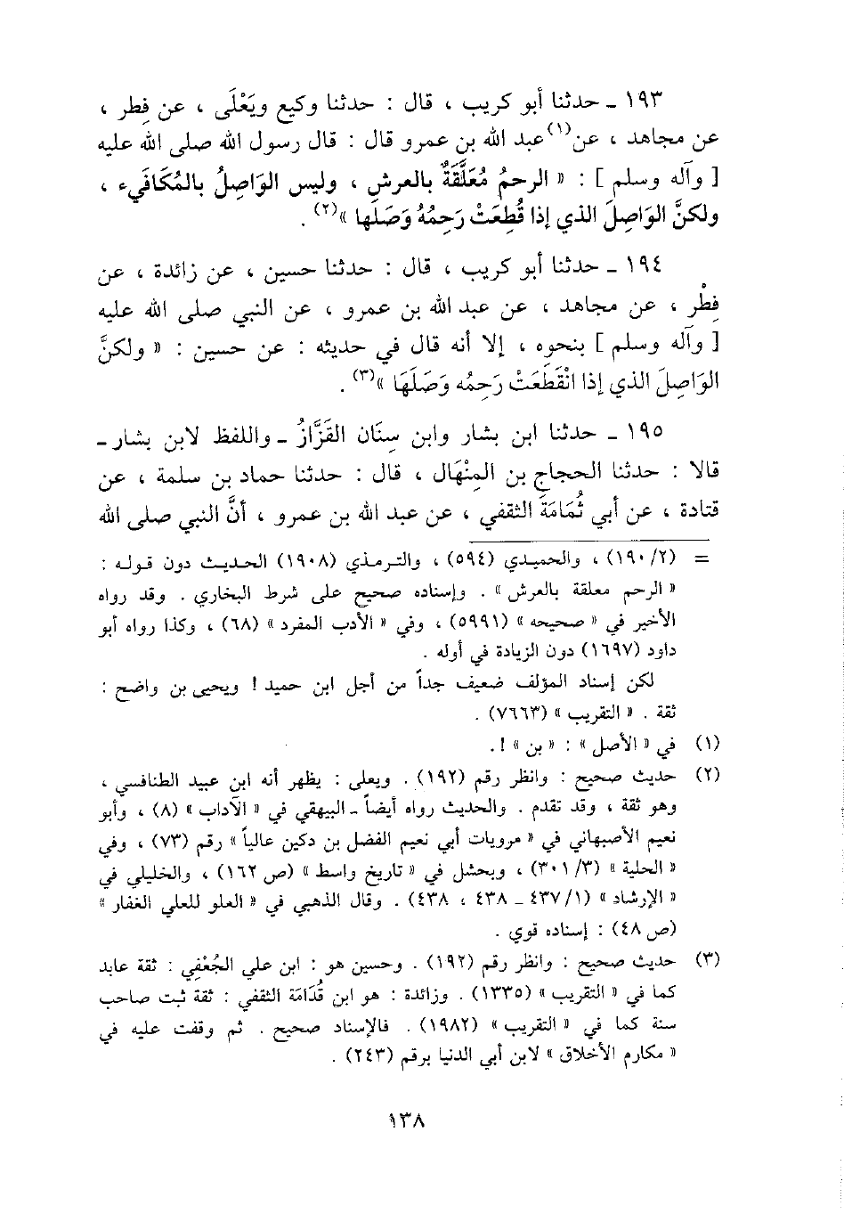 193 - حَدثنَا أَبُو كريب، قَالَ: حَدثنَا وَكِيع ويعلى، عَن فطر، عَن مُجَاهِد، عَن عبد الله بن عَمْرو قَالَ: قَالَ رَسُول الله - صَلَّى اللَّهُ عَلَيْهِ وَسَلَّم َ -: " الرَّحِم معلقَة بالعرش، وَلَيْسَ الْوَاصِل بالمكافئ، وَلَكِن الْوَاصِل الَّذِي إِذا قطعت رَحمَه وَصلهَا ".