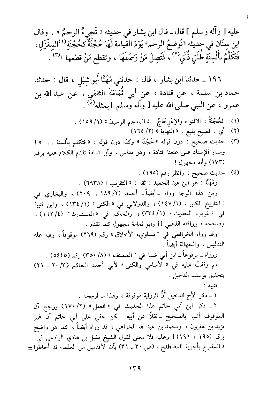قَالَ - قَالَ ابْن بشار فِي حَدِيثه " تَجِيء الرَّحِم ". وَقَالَ ابْن سِنَان فِي حَدِيثه " تُوضَع الرَّحِم " يَوْم الْقِيَامَة لَهَا حجنة كحجنة المغزل، فَتكلم بألسنة طلق ذلق، فتصل من وَصلهَا، وتقطع من قطعهَا ".
