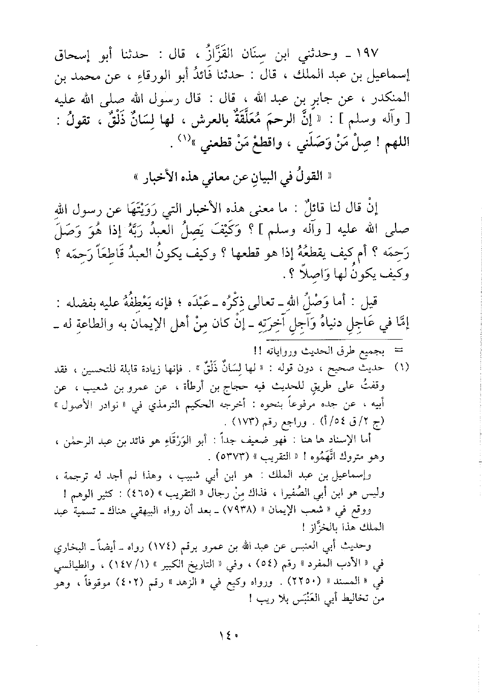 197 - وحَدثني ابْن سِنَان الْقَزاز، قَالَ: حَدثنَا أَبُو إِسْحَاق إِسْمَاعِيل بن عبد الْملك، قَالَ: حَدثنَا فائد أَبُو الورقاء، عَن مُحَمَّد بن الْمُنْكَدر، عَن جَابر بن عبد الله، قَالَ: قَالَ رَسُول الله - صَلَّى اللَّهُ عَلَيْهِ وَسَلَّم َ -: " إِن الرَّحِم معلقَة بالعرش، لَهَا لِسَان ذلق، تَقول: اللَّهُمَّ! صل من وصلني، واقطع من قطعني ".