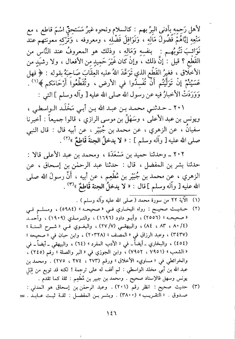 201 - حَدثنِي مُحَمَّد بن عبد الله بن أبي مخلد الوَاسِطِيّ، وَيُونُس بن عبد الْأَعْلَى، وَسَهل بن مُوسَى الرَّازِيّ، قَالُوا جَمِيعًا: أخبرنَا سُفْيَان، عَن الزُّهْرِيّ، عَن مُحَمَّد بن جُبَير، عَن أَبِيه قَالَ: قَالَ النَّبِي - صَلَّى اللَّهُ عَلَيْهِ وَسَلَّم َ -: " لَا يدْخل الْجنَّة قَاطع ".