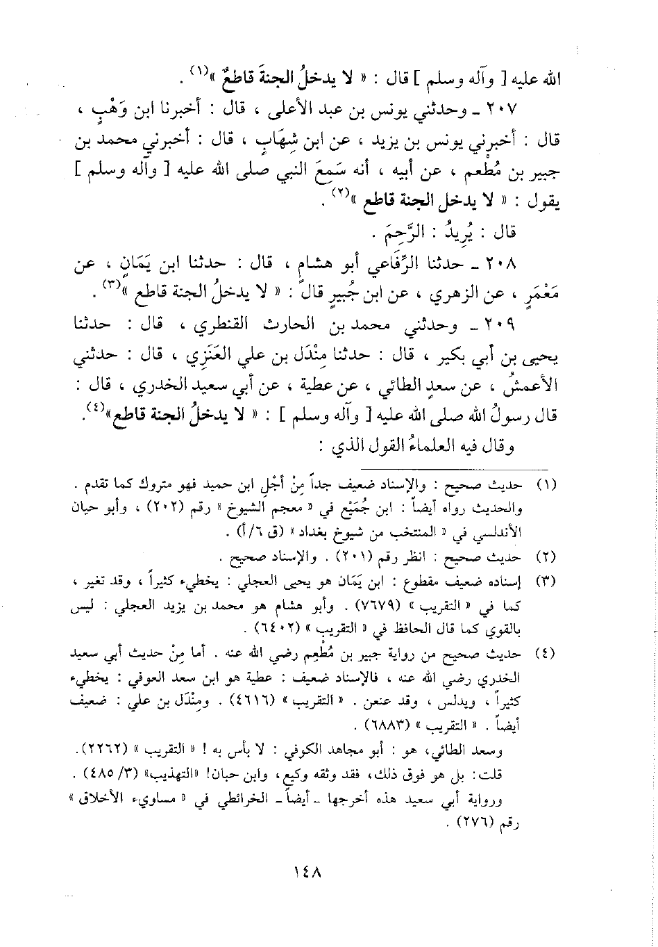 208 - حَدثنَا الرِّفَاعِي أَبُو هِشَام، قَالَ: حَدثنَا ابْن يمَان، عَن معمر، عَن الزُّهْرِيّ، عَن ابْن جُبَير قَالَ: " لَا يدْخل الْجنَّة قَاطع ".