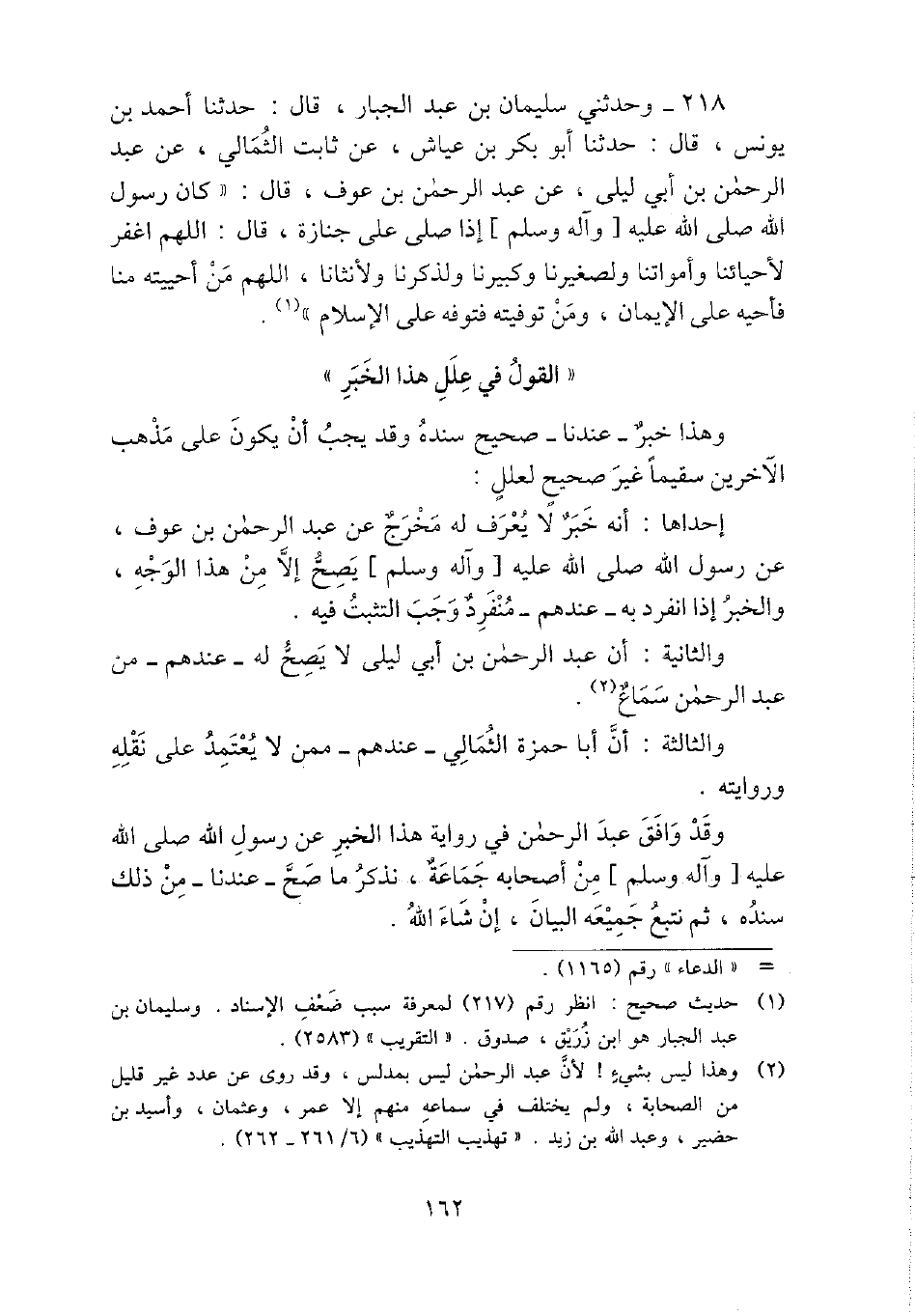 218 - وحَدثني سُلَيْمَان بن عبد الْجَبَّار، قَالَ: حَدثنَا أَحْمد بن يُونُس، قَالَ: حَدثنَا أَبُو بكر بن عَيَّاش، عَن ثَابت الثمالِي، عَن عبد الرَّحْمَن بن أبي ليلى، عَن عبد الرَّحْمَن بن عَوْف، قَالَ: " كَانَ رَسُول الله - صَلَّى اللَّهُ عَلَيْهِ وَسَلَّم َ - إِذا صلى على جَنَازَة، قَالَ: اللَّهُمَّ اغْفِر لأحيائنا وأمواتنا ولصغيرنا وَكَبِيرنَا ولذكرنا ولأنثانا، اللَّهُمَّ من أحييته منا فأحيه على الْإِيمَان، وَمن توفيته فتوفه على الْإِسْلَام ".