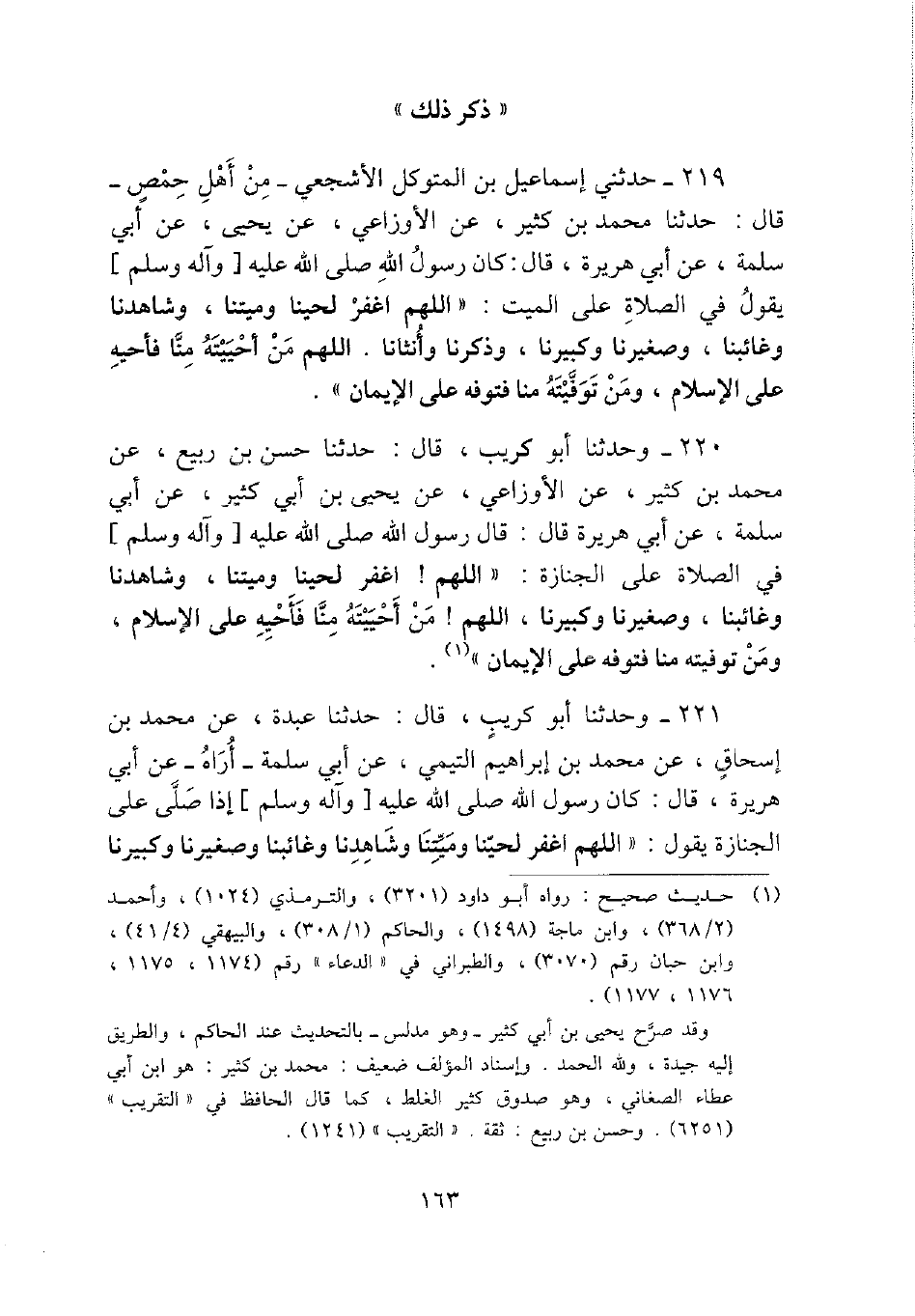 219 - حَدثنِي إِسْمَاعِيل بن المتَوَكل الْأَشْجَعِيّ - من أهل حمص - قَالَ: حَدثنَا مُحَمَّد بن كثير، عَن الْأَوْزَاعِيّ، عَن يحيى، عَن أبي سَلمَة، عَن أبي هُرَيْرَة، قَالَ: كَانَ رَسُول الله - صَلَّى اللَّهُ عَلَيْهِ وَسَلَّم َ - يَقُول فِي الصَّلَاة على الْمَيِّت: " اللَّهُمَّ اغْفِر لحينا وميتنا، وشاهدنا وغائبنا، وصغيرنا وَكَبِيرنَا، وَذكرنَا وأنثانا. اللَّهُمَّ من أحييته منا فأحيه على الْإِسْلَام، وَمن توفيته منا فتوفه على الْإِيمَان ".