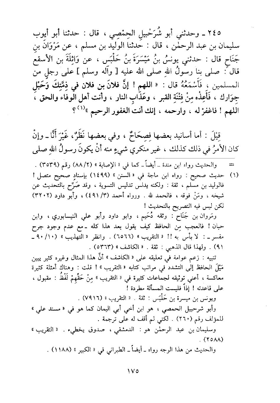 245 - وحَدثني أَبُو شُرَحْبِيل الْحِمصِي، قَالَ: حَدثنَا أَبُو أَيُّوب سُلَيْمَان بن عبد الرَّحْمَن، قَالَ: حَدثنَا الْوَلِيد بن مُسلم، عَن مَرْوَان بن جنَاح قَالَ: حَدثنِي يُونُس بن ميسرَة بن حَلبس، عَن وَاثِلَة بن الْأَسْقَع قَالَ: صلى بِنَا رَسُول الله - صَلَّى اللَّهُ عَلَيْهِ وَسَلَّم َ - على رجل من الْمُسلمين، فأسمعه قَالَ: " اللَّهُمَّ {إِن فلَان بن فلَان فِي ذِمَّتك وحبل جوارك، فأعذه من فتْنَة الْقَبْر، وَعَذَاب النَّار، وَأَنت أهل الْوَفَاء وَالْحق، اللَّهُمَّ} فَاغْفِر لَهُ، وارحمه، إِنَّك أَنْت الغفور الرَّحِيم "؟