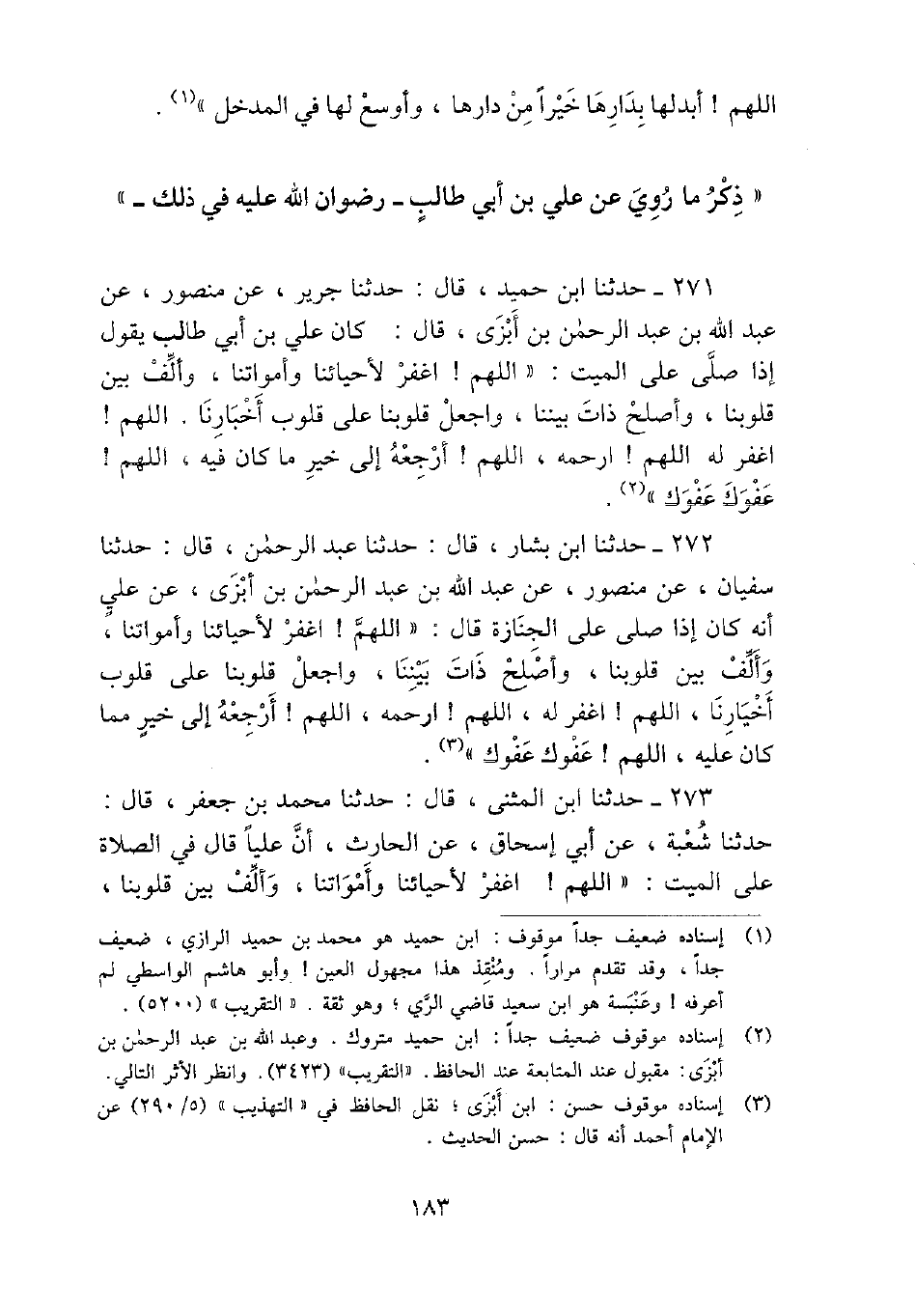 272 - حَدثنَا ابْن بشار، قَالَ: حَدثنَا عبد الرَّحْمَن، قَالَ: حَدثنَا سُفْيَان، عَن مَنْصُور، عَن عبد الله بن عبد الرَّحْمَن بن أَبْزَى، عَن عَليّ أَنه كَانَ إِذا صلى على الْجِنَازَة قَالَ: " اللَّهُمَّ {اغْفِر لأحيائنا وأمواتنا، وَألف بَين قُلُوبنَا، وَأصْلح ذَات بَيْننَا، وَاجعَل قُلُوبنَا على قُلُوب أخيارنا، اللَّهُمَّ} اغْفِر لَهُ، اللَّهُمَّ {ارحمه، اللَّهُمَّ} أرجعه إِلَى خير مِمَّا كَانَ عَلَيْهِ، اللَّهُمَّ {عفوك عفوك ".