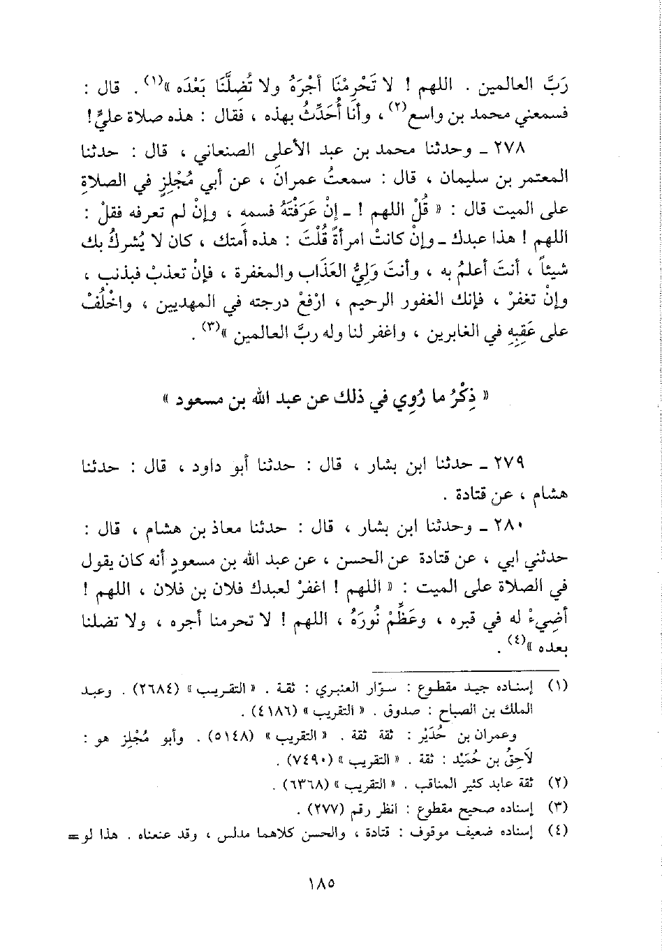 280 - وَحدثنَا ابْن بشار، قَالَ: حَدثنَا معَاذ بن هِشَام، قَالَ: حَدثنِي أبي، عَن قَتَادَة عَن الْحسن، عَن عبد الله بن مَسْعُود أَنه كَانَ يَقُول فِي الصَّلَاة على الْمَيِّت: " اللَّهُمَّ {اغْفِر لعبدك فلَان بن فلَان، اللَّهُمَّ} أضيء لَهُ فِي قَبره، وَعظم نوره، اللَّهُمَّ! لَا تَحْرِمنَا أجره، وَلَا تضلنا بعده ".