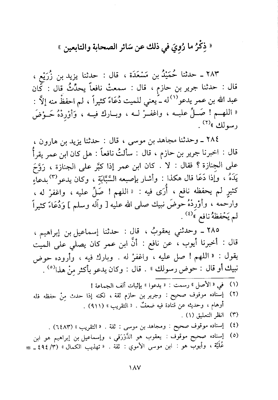 285 - وحَدثني يَعْقُوب، قَالَ: حَدثنَا إِسْمَاعِيل بن إِبْرَاهِيم، قَالَ: أخبرنَا أَيُّوب، عَن نَافِع: أَن ابْن عمر كَانَ يُصَلِّي على الْمَيِّت يَقُول: " اللَّهُمَّ! صل عَلَيْهِ، واغفر لَهُ. وَبَارك فِيهِ، وَأوردهُ حَوْض نبيك أَو قَالَ: حَوْض رَسُولك ". قَالَ: وَكَانَ يَدْعُو بِأَكْثَرَ من هَذَا.