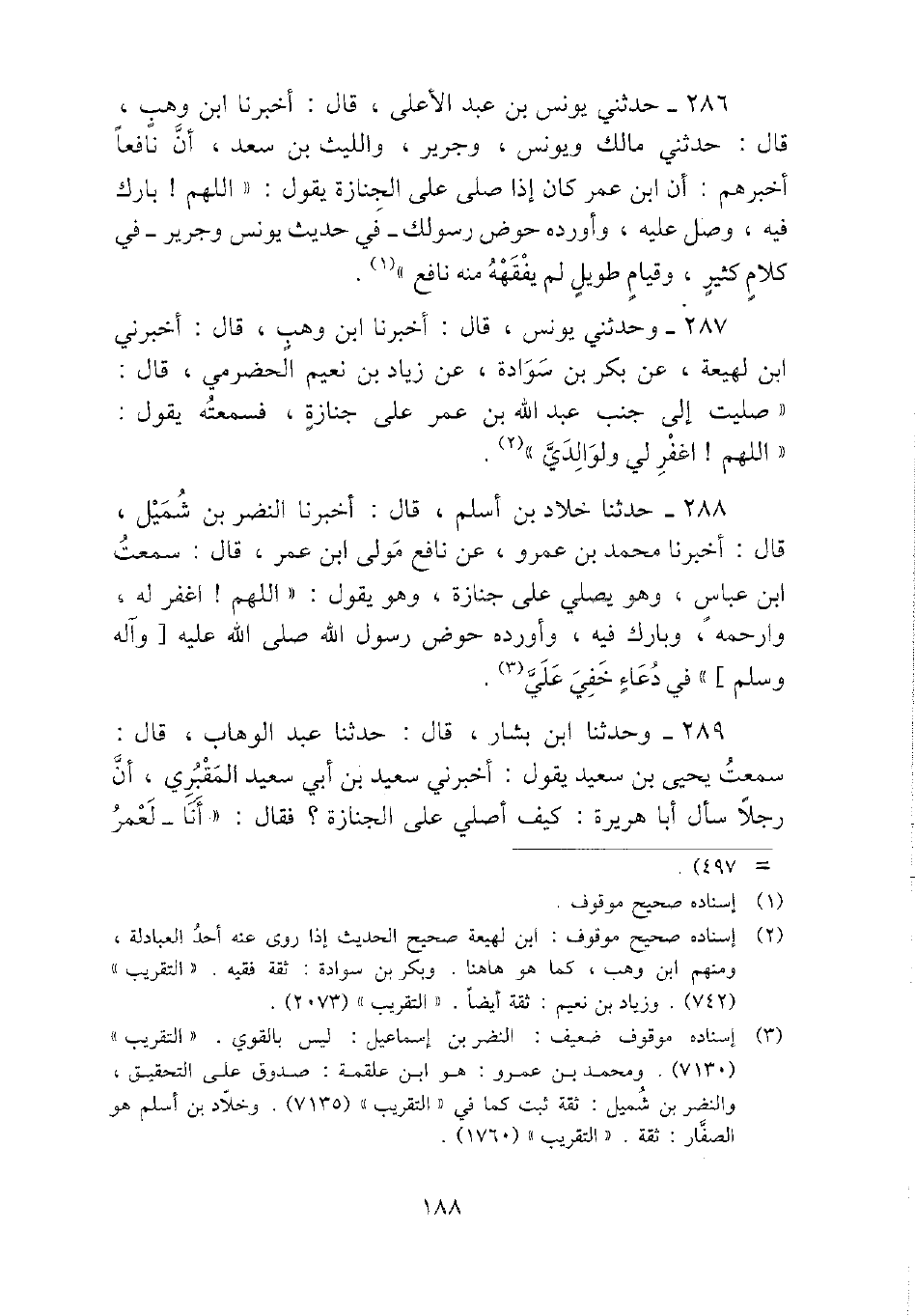 287 - وحَدثني يُونُس، قَالَ: أخبرنَا ابْن وهب، قَالَ: أَخْبرنِي ابْن لَهِيعَة، عَن بكر بن سوَادَة، عَن زِيَاد بن نعيم الْحَضْرَمِيّ، قَالَ: " صليت إِلَى جنب عبد الله بن عمر على جَنَازَة، فَسَمعته يَقُول: " اللَّهُمَّ} اغْفِر لي ولوالدي ".