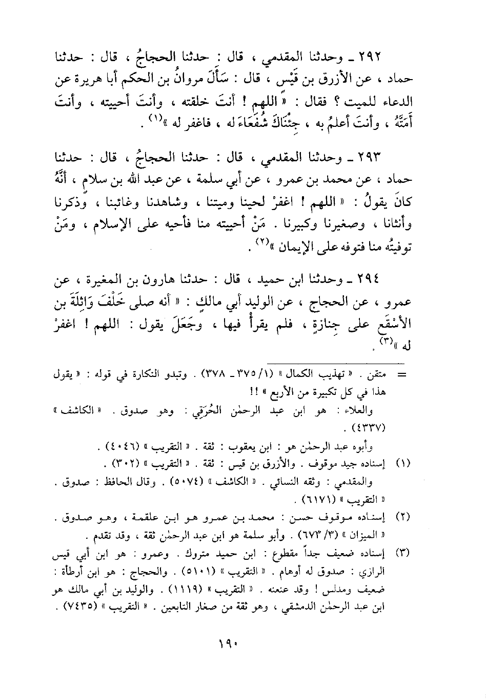 293 - وَحدثنَا الْمقدمِي، قَالَ: حَدثنَا الْحجَّاج، قَالَ: حَدثنَا حَمَّاد، عَن مُحَمَّد بن عَمْرو، عَن أبي سَلمَة، عَن عبد الله بن سَلام، أَنه كَانَ يَقُول: " اللَّهُمَّ} اغْفِر لحينا وميتنا، وشاهدنا وغائبنا، وَذكرنَا وأنثانا، وصغيرنا وَكَبِيرنَا. من أحييته منا فأحيه على الْإِسْلَام، وَمن توفيته منا فتوفه على الْإِيمَان ".