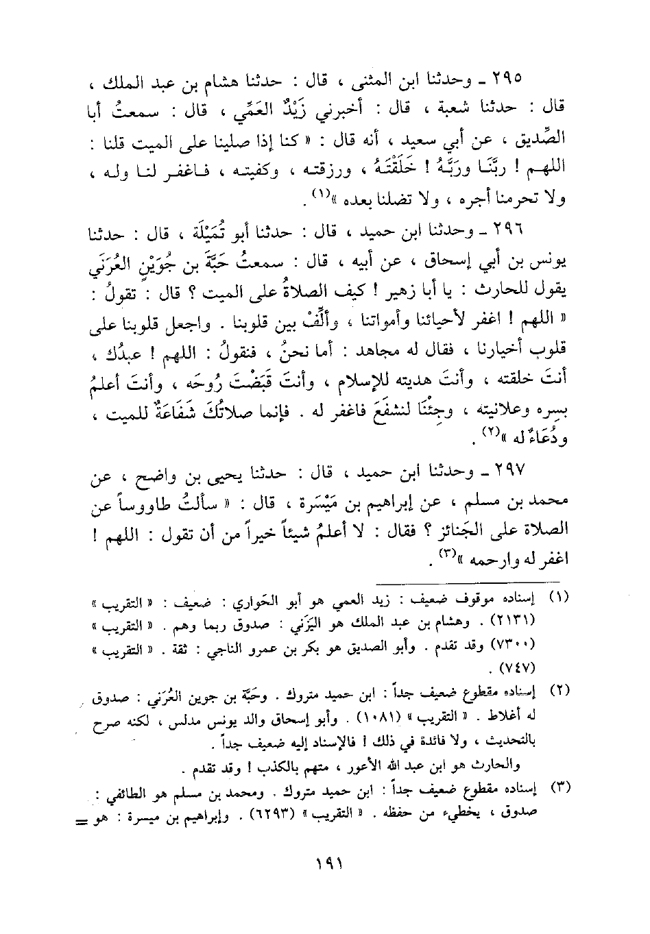 296 - وَحدثنَا ابْن حميد، قَالَ: حَدثنَا أَبُو تُمَيْلة، قَالَ: حَدثنَا يُونُس بن أبي إِسْحَاق، عَن أَبِيه، قَالَ: سَمِعت حَبَّة بن جُوَيْن العرني يَقُول لِلْحَارِثِ: يَا أَبَا زُهَيْر {كَيفَ الصَّلَاة على الْمَيِّت؟ قَالَ: تَقول: " اللَّهُمَّ} اغْفِر لأحيائنا وأمواتنا، وَألف بَين قُلُوبنَا. وَاجعَل قُلُوبنَا على قُلُوب أخيارنا، فَقَالَ لَهُ مُجَاهِد: أما نَحن، فَنَقُول: اللَّهُمَّ {عَبدك، أَنْت خلقته، وَأَنت هديته لِلْإِسْلَامِ، وَأَنت قبضت روحه، وَأَنت أعلم بسره وعلانيته، وَجِئْنَا لنشفع فَاغْفِر لَهُ. فَإِنَّمَا صَلَاتك شَفَاعَة للْمَيت، وَدُعَاء لَهُ ".