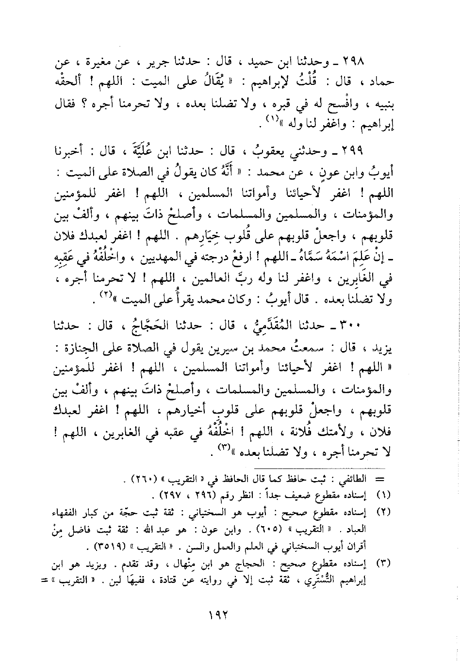 300 - حَدثنَا الْمقدمِي، قَالَ: حَدثنَا الْحجَّاج، قَالَ: حَدثنَا يزِيد، قَالَ: سَمِعت مُحَمَّد بن سِيرِين يَقُول فِي الصَّلَاة على الْجِنَازَة: " اللَّهُمَّ {اغْفِر لأحيائنا وأمواتنا الْمُسلمين، اللَّهُمَّ} اغْفِر للْمُؤْمِنين وَالْمُؤْمِنَات، وَالْمُسْلِمين وَالْمُسلمَات، وَأصْلح ذَات بَينهم، وَألف بَين قُلُوبهم، وَاجعَل قُلُوبهم على قُلُوب أخيارهم، اللَّهُمَّ {اغْفِر لعبدك فلَان، وَلِأُمَّتِك فُلَانَة، اللَّهُمَّ} اخلفه فِي عقبه فِي الغابرين، اللَّهُمَّ! لَا تَحْرِمنَا أجره، وَلَا تضلنا بعده ".
