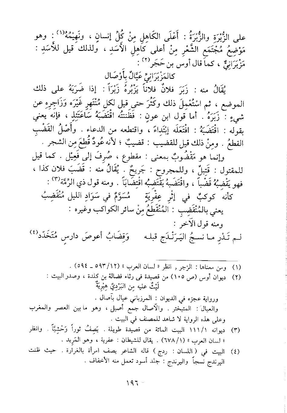 يُقَال مِنْهُ: زبر فلَان فلَانا يزبره زبرا: إِذا ضربه على ذَلِك الْموضع، ثمَّ اسْتعْمل ذَلِك وَكثر حَتَّى قيل لكل منتهر غَيره وزاجره عَن شَيْء: زبره. أما قَول ابْن عون: فظننته اقتضبه ساعتئذ، فَإِنَّهُ يَعْنِي بقوله: اقتضبه: افتعله إبتداء، واقتطعه من الدُّعَاء. وأصل القضب الْقطع. وَمن ذَلِك قيل للقضيب: قضيب؛ لِأَنَّهُ عود قطع من الشّجر.