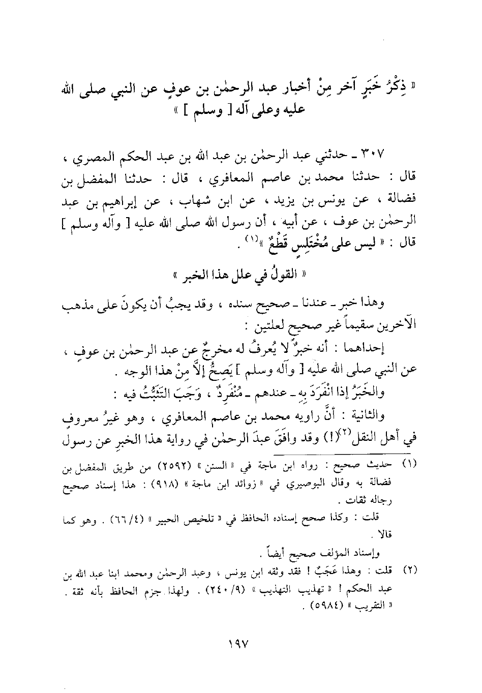 307 - حَدثنِي عبد الرَّحْمَن بن عبد الله بن عبد الحكم الْمصْرِيّ، قَالَ: حَدثنَا مُحَمَّد بن عَاصِم الْمعَافِرِي، قَالَ: حَدثنَا الْمفضل بن فضَالة، عَن يُونُس بن يزِيد، عَن ابْن شهَاب، عَن إِبْرَاهِيم بن عبد الرَّحْمَن بن عَوْف، عَن أَبِيه، أَن رَسُول الله - صَلَّى اللَّهُ عَلَيْهِ وَسَلَّم َ - قَالَ: " لَيْسَ على مختلس قطع ".
