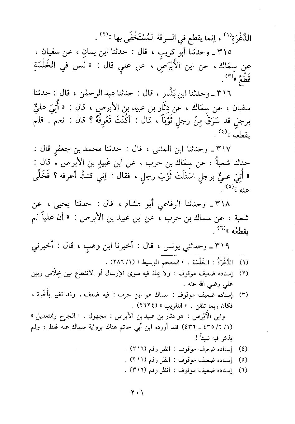 316 - وَحدثنَا ابْن بشار، قَالَ: حَدثنَا عبد الرَّحْمَن، قَالَ: حَدثنَا سُفْيَان، عَن سماك، عَن دثار بن عبيد بن الأبرص، قَالَ: " أُتِي عَليّ بِرَجُل قد سرق من رجل ثوبا، قَالَ: أَكنت تعرفه؟ قَالَ: نعم. فَلم يقطعهُ ".