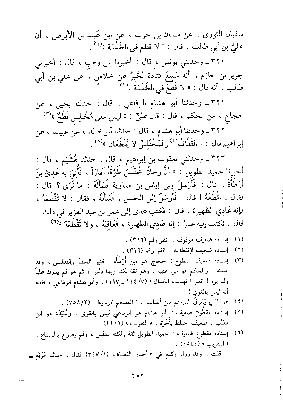 323 - وحَدثني يَعْقُوب بن إِبْرَاهِيم، قَالَ: حَدثنَا هشيم، قَالَ: أخبرنَا حميد الطَّوِيل: " أَن رجلا اختلس طوقا نَهَارا، فَأتي بِهِ عدي بن أَرْطَأَة، قَالَ: فَأرْسل إِلَى إِيَاس بن مُعَاوِيَة فَسَأَلَهُ: مَا ترى؟ قَالَ: فَقَالَ: اقطعه! قَالَ: فَأرْسل إِلَى الْحسن، فَسَأَلَهُ، فَقَالَ: لَا تقطعه، فَإِنَّهُ عادي الظهيرة. قَالَ: فَكتب عدي إِلَى عمر بن عبد الْعَزِيز فِي ذَلِك. قَالَ: فَكتب إِلَيْهِ عمر: إِنَّه عادي الظهيرة، فعاقبه، وَلَا تقطعه ".
