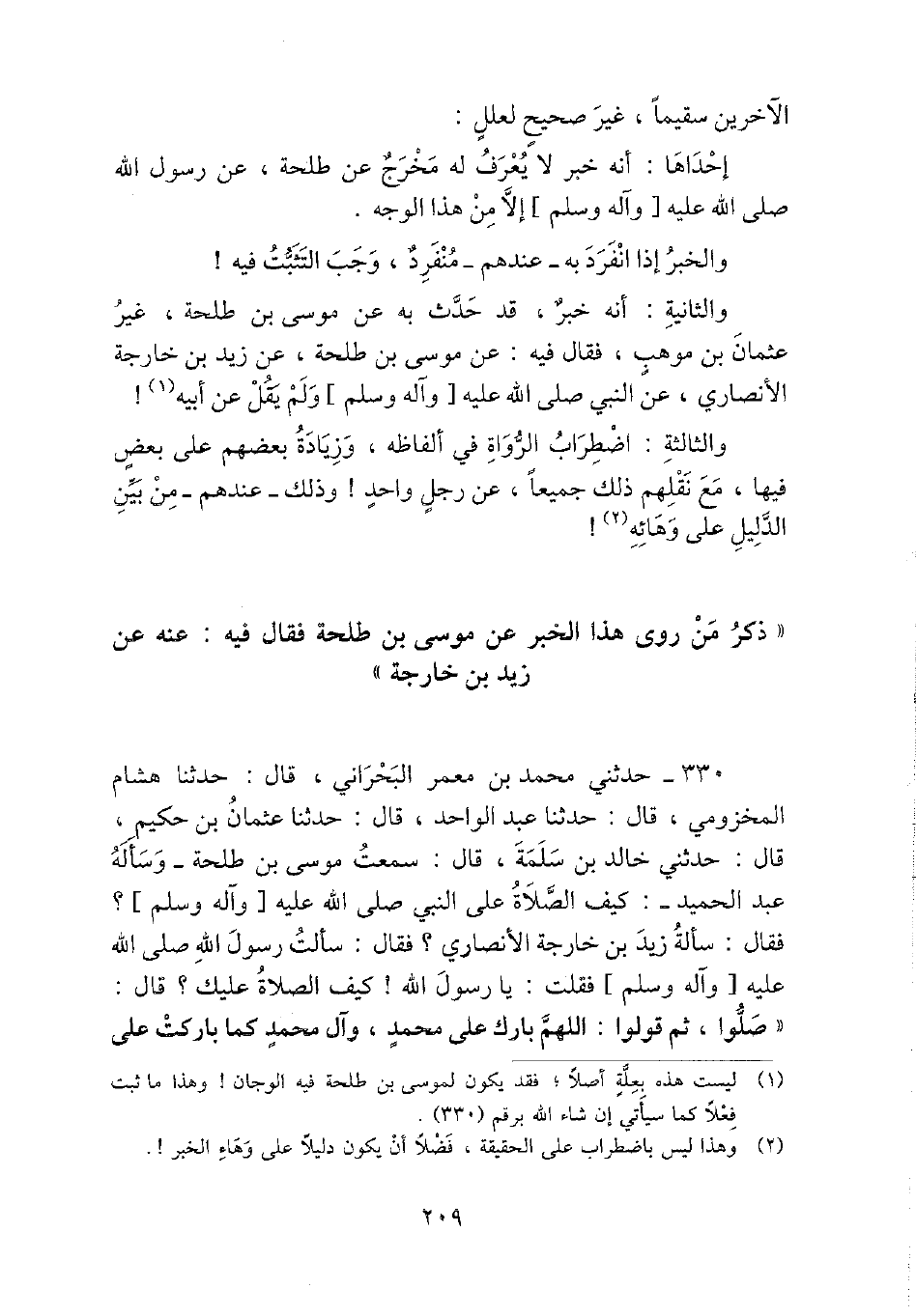 330 - حَدثنِي مُحَمَّد بن معمر البحراني، قَالَ: حَدثنَا هِشَام المَخْزُومِي، قَالَ: حَدثنَا عبد الْوَاحِد، قَالَ: حَدثنَا عُثْمَان بن حَكِيم، قَالَ: حَدثنِي خَالِد بن سَلمَة، قَالَ: سَمِعت مُوسَى بن طَلْحَة - وَسَأَلَهُ عبد الحميد -: كَيفَ الصَّلَاة على النَّبِي - صَلَّى اللَّهُ عَلَيْهِ وَسَلَّم َ -؟ فَقَالَ: سَأَلَهُ زيد بن خَارِجَة الْأنْصَارِيّ؟ فَقَالَ: سَأَلت رَسُول الله - صَلَّى اللَّهُ عَلَيْهِ وَسَلَّم َ - فَقلت: يَا رَسُول الله! كَيفَ الصَّلَاة عَلَيْك؟ قَالَ: " صلوا، ثمَّ قُولُوا: اللَّهُمَّ بَارك على مُحَمَّد، وَآل مُحَمَّد كَمَا باركت على