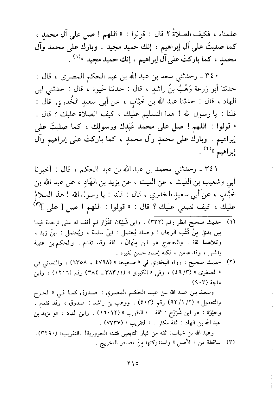 340 - وحَدثني سعد بن عبد الله بن عبد الحكم الْمصْرِيّ، قَالَ: حَدثنَا أَبُو زرْعَة وهب بن رَاشد، قَالَ: حَدثنَا حَيْوَة، قَالَ: حَدثنِي ابْن الْهَاد، قَالَ: حَدثنَا عبد الله بن خباب، عَن أبي سعيد الْخُدْرِيّ قَالَ: قُلْنَا: يَا رَسُول الله} هَذَا التَّسْلِيم عَلَيْك، كَيفَ الصَّلَاة عَلَيْك؟ قَالَ: " قُولُوا: اللَّهُمَّ {صل على مُحَمَّد عَبدك وَرَسُولك، كَمَا صليت على إِبْرَاهِيم. وَبَارك على مُحَمَّد وَآل مُحَمَّد، كَمَا باركت على إِبْرَاهِيم وَآل إِبْرَاهِيم ".