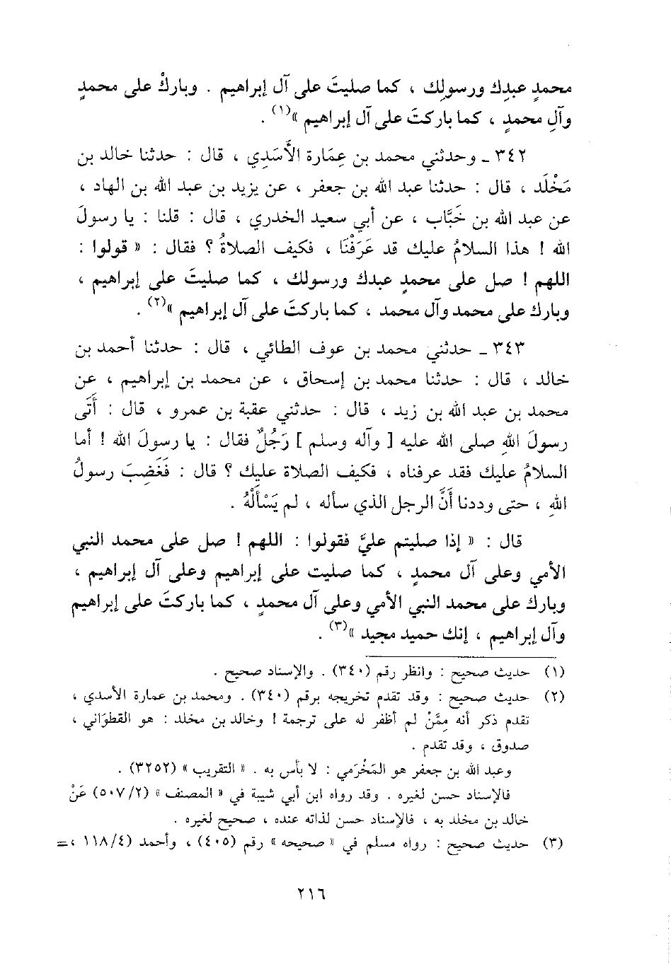 342 - وحَدثني مُحَمَّد بن عمَارَة الْأَسدي، قَالَ: حَدثنَا خَالِد بن مخلد، قَالَ: حَدثنَا عبد الله بن جَعْفَر، عَن يزِيد بن عبد الله بن الْهَاد، عَن عبد الله بن خباب، عَن أبي سعيد الْخُدْرِيّ، قَالَ: قُلْنَا: يَا رَسُول الله {هَذَا السَّلَام عَلَيْك قد عرفنَا، فَكيف الصَّلَاة؟ فَقَالَ: " قُولُوا: اللَّهُمَّ} صل على مُحَمَّد عَبدك وَرَسُولك، كَمَا صليت على إِبْرَاهِيم، وَبَارك على مُحَمَّد وَآل مُحَمَّد، كَمَا باركت على آل إِبْرَاهِيم ".