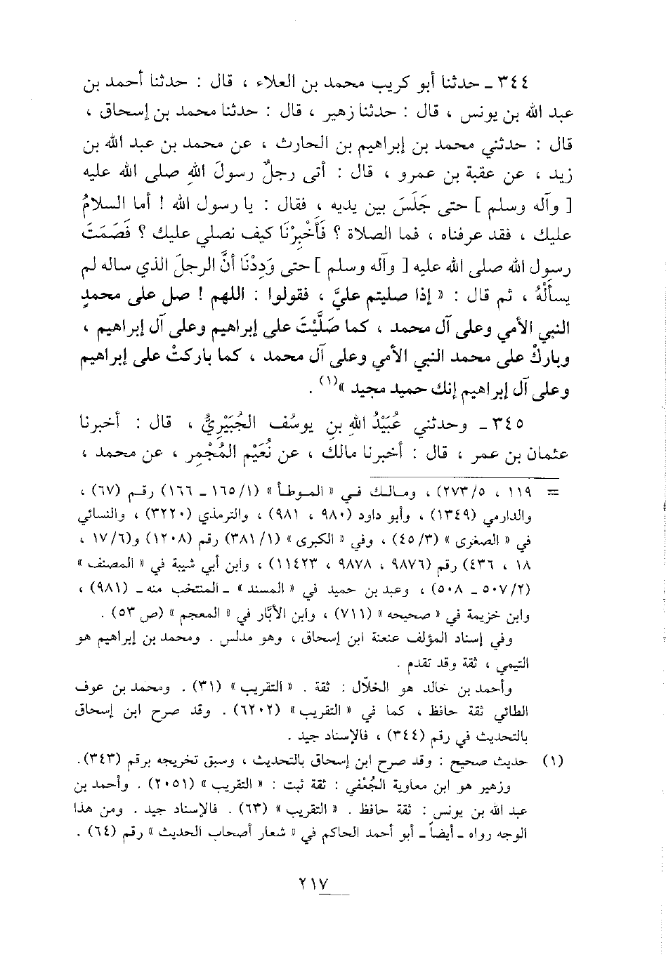 344 - حَدثنَا أَبُو كريب مُحَمَّد بن الْعَلَاء، قَالَ: حَدثنَا أَحْمد بن عبد الله بن يُونُس، قَالَ: حَدثنَا زُهَيْر، قَالَ: حَدثنَا مُحَمَّد بن إِسْحَاق، قَالَ: حَدثنِي مُحَمَّد بن إِبْرَاهِيم بن الْحَارِث، عَن مُحَمَّد بن عبد الله بن زيد، عَن عقبَة بن عَمْرو، قَالَ: أَتَى رجل رَسُول الله - صَلَّى اللَّهُ عَلَيْهِ وَسَلَّم َ - حَتَّى جلس بَين يَدَيْهِ، فَقَالَ: يَا رَسُول الله {أما السَّلَام عَلَيْك، فقد عَرفْنَاهُ، فَمَا الصَّلَاة؟ فَأخْبرنَا كَيفَ نصلي عَلَيْك؟ فَصمت رَسُول الله - صَلَّى اللَّهُ عَلَيْهِ وَسَلَّم َ - حَتَّى وَدِدْنَا أَن الرجل الَّذِي سَأَلَهُ لم يسْأَله، ثمَّ قَالَ: " إِذا صليتم عَليّ، فَقولُوا: اللَّهُمَّ} صل على مُحَمَّد النَّبِي الْأُمِّي وعَلى آل مُحَمَّد، كَمَا صليت على إِبْرَاهِيم وعَلى آل إِبْرَاهِيم، وَبَارك على مُحَمَّد النَّبِي الْأُمِّي وعَلى آل مُحَمَّد، كَمَا باركت على إِبْرَاهِيم وعَلى آل إِبْرَاهِيم إِنَّك حميد مجيد ".