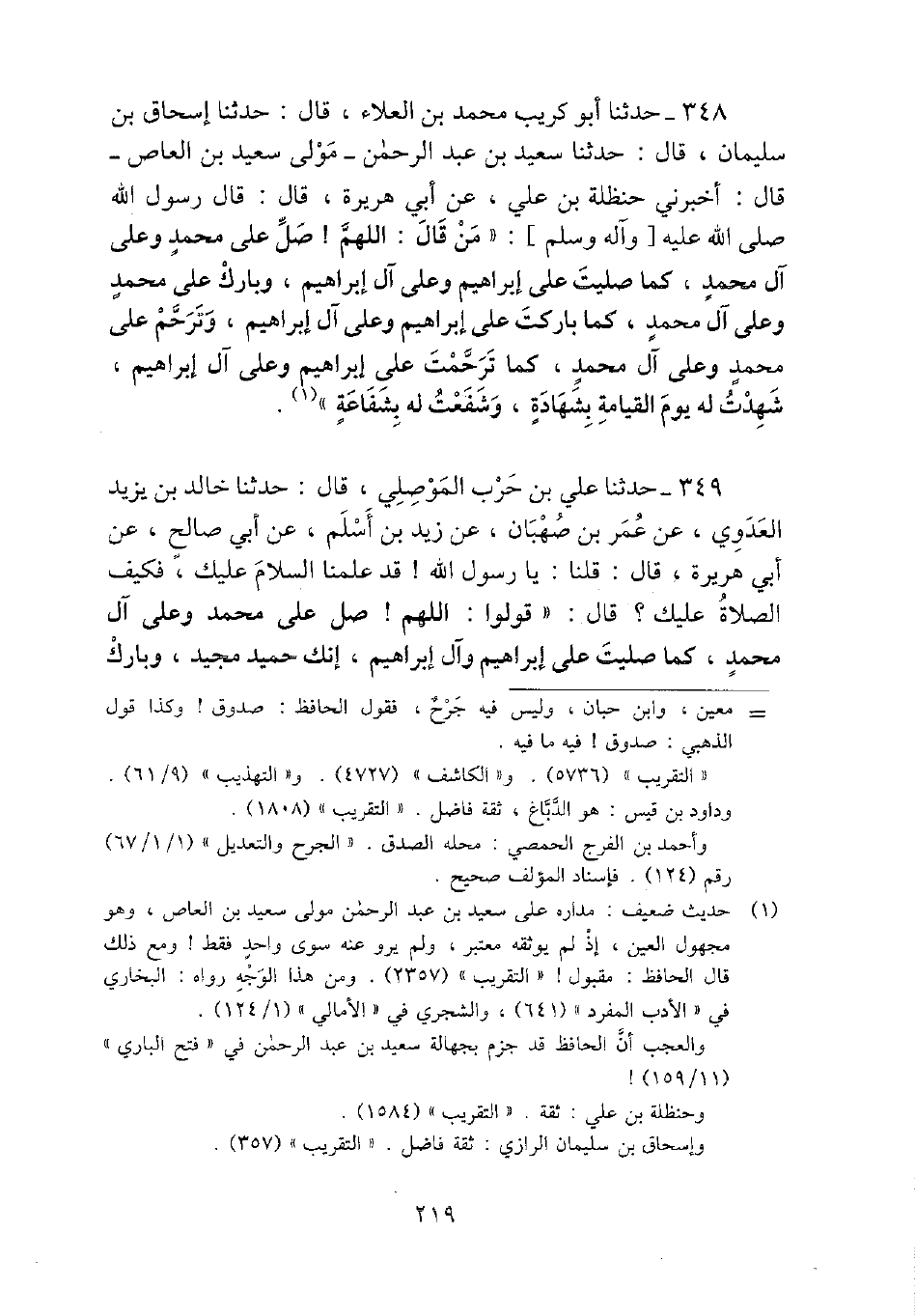 348 - حَدثنَا أَبُو كريب مُحَمَّد بن الْعَلَاء، قَالَ: حَدثنَا إِسْحَاق بن سُلَيْمَان، قَالَ: حَدثنَا سعيد بن عبد الرَّحْمَن - مولى سعيد بن الْعَاصِ - قَالَ: أَخْبرنِي حَنْظَلَة بن عَليّ، عَن أبي هُرَيْرَة، قَالَ: قَالَ رَسُول الله - صَلَّى اللَّهُ عَلَيْهِ وَسَلَّم َ -: " من قَالَ: اللَّهُمَّ {صل على مُحَمَّد وعَلى آل مُحَمَّد، كَمَا صليت على إِبْرَاهِيم وعَلى آل إِبْرَاهِيم، وَبَارك على مُحَمَّد وعَلى آل مُحَمَّد، كَمَا باركت على إِبْرَاهِيم وعَلى آل إِبْرَاهِيم، وترحم على مُحَمَّد وعَلى آل مُحَمَّد، كَمَا ترحمت على إِبْرَاهِيم وعَلى آل إِبْرَاهِيم، شهِدت لَهُ يَوْم الْقِيَامَة بِشَهَادَة، وشفعت لَهُ بشفاعة ".