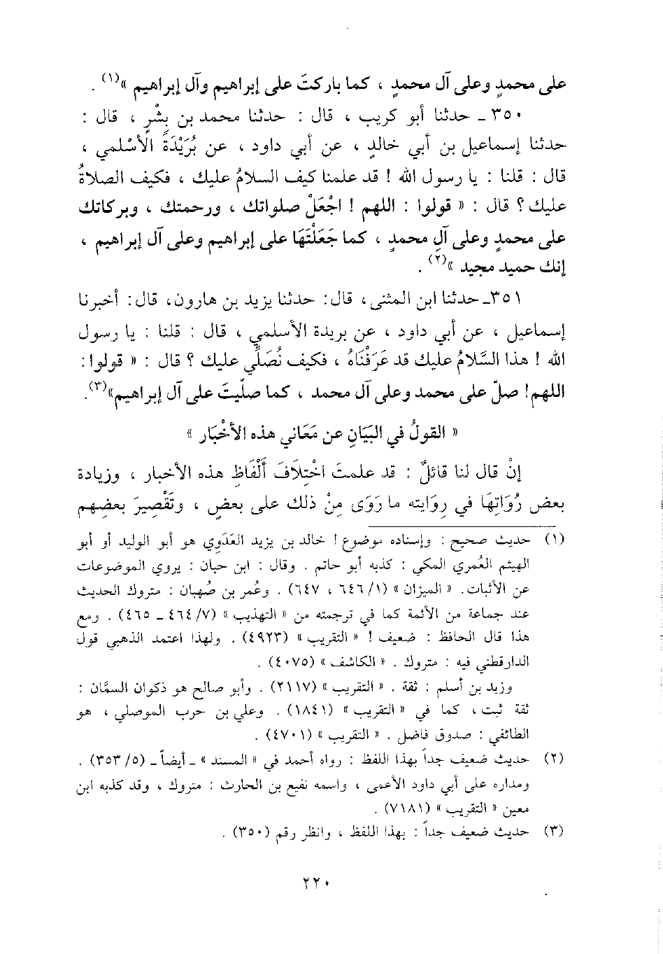 350 - حَدثنَا أَبُو كريب، قَالَ: حَدثنَا مُحَمَّد بن بشر، قَالَ: حَدثنَا إِسْمَاعِيل بن أبي خَالِد، عَن أبي دَاوُد، عَن بُرَيْدَة الْأَسْلَمِيّ، قَالَ: قُلْنَا: يَا رَسُول الله {قد علمنَا كَيفَ السَّلَام عَلَيْك، فَكيف الصَّلَاة عَلَيْك؟ قَالَ: " قُولُوا: اللَّهُمَّ} اجْعَل صلواتك، ورحمتك، وبركاتك على مُحَمَّد وعَلى آل مُحَمَّد، كَمَا جَعلتهَا على إِبْرَاهِيم وعَلى آل إِبْرَاهِيم، إِنَّك حميد مجيد ".