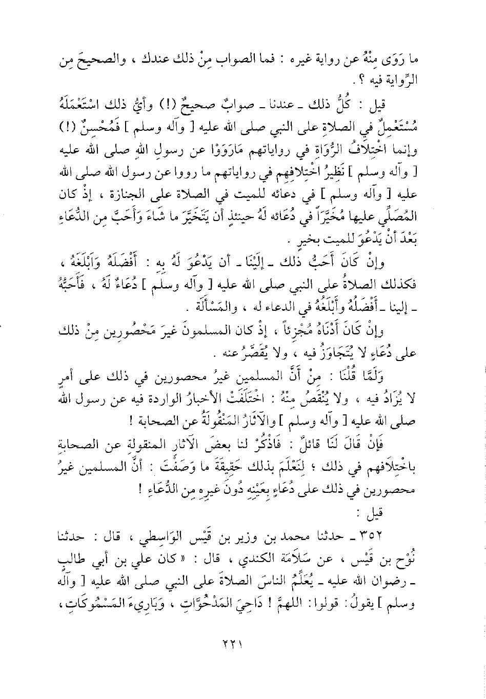فَإِن قَالَ لنا قَائِل: فاذكر لنا بعض الْآثَار المنقولة عَن الصَّحَابَة باختلافهم فِي ذَلِك؛ لنعلم بذلك حَقِيقَة مَا وصفت: أَن الْمُسلمين غير مَحْصُورين فِي ذَلِك على دُعَاء بِعَيْنِه دون غَيره من الدُّعَاء}