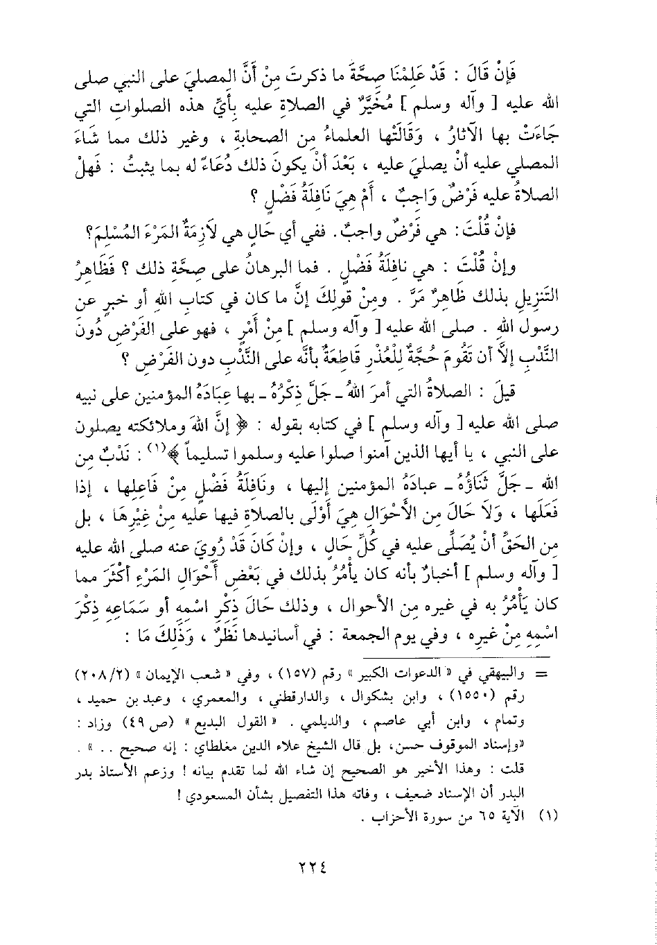 فَإِن قَالَ: قد علمنَا صِحَة مَا ذكرت من أَن الْمُصَلِّي على النَّبِي - صَلَّى اللَّهُ عَلَيْهِ وَسَلَّم َ - مُخَيّر فِي الصَّلَاة عَلَيْهِ بِأَيّ هَذِه الصَّلَوَات الَّتِي جَاءَت بهَا الْآثَار، وقالتها الْعلمَاء من الصَّحَابَة، وَغير ذَلِك مِمَّا شَاءَ الْمُصَلِّي عَلَيْهِ أَن يُصَلِّي عَلَيْهِ، بعد أَن يكون ذَلِك دُعَاء لَهُ بِمَا يثبت: فَهَل الصَّلَاة عَلَيْهِ فرض وَاجِب، أم هِيَ نَافِلَة فضل؟