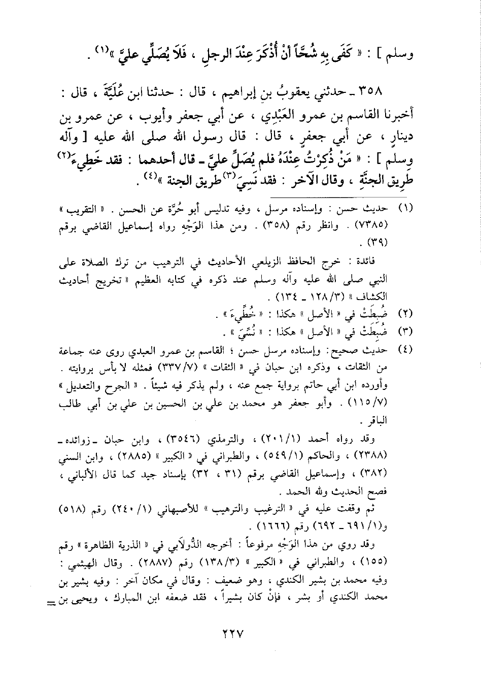 358 - حَدثنِي يَعْقُوب بن إِبْرَاهِيم، قَالَ: حَدثنَا ابْن علية، قَالَ: أخبرنَا الْقَاسِم بن عَمْرو الْعَبْدي، عَن أبي جَعْفَر وَأَيوب، عَن عَمْرو بن دِينَار، عَن أبي جَعْفَر، قَالَ: قَالَ رَسُول الله - صَلَّى اللَّهُ عَلَيْهِ وَسَلَّم َ -: " من ذكرت عِنْده فَلم يصل عَليّ - قَالَ أَحدهمَا: فقد خطيء طَرِيق الْجنَّة، وَقَالَ الآخر: فقد نسي طَرِيق الْجنَّة ".