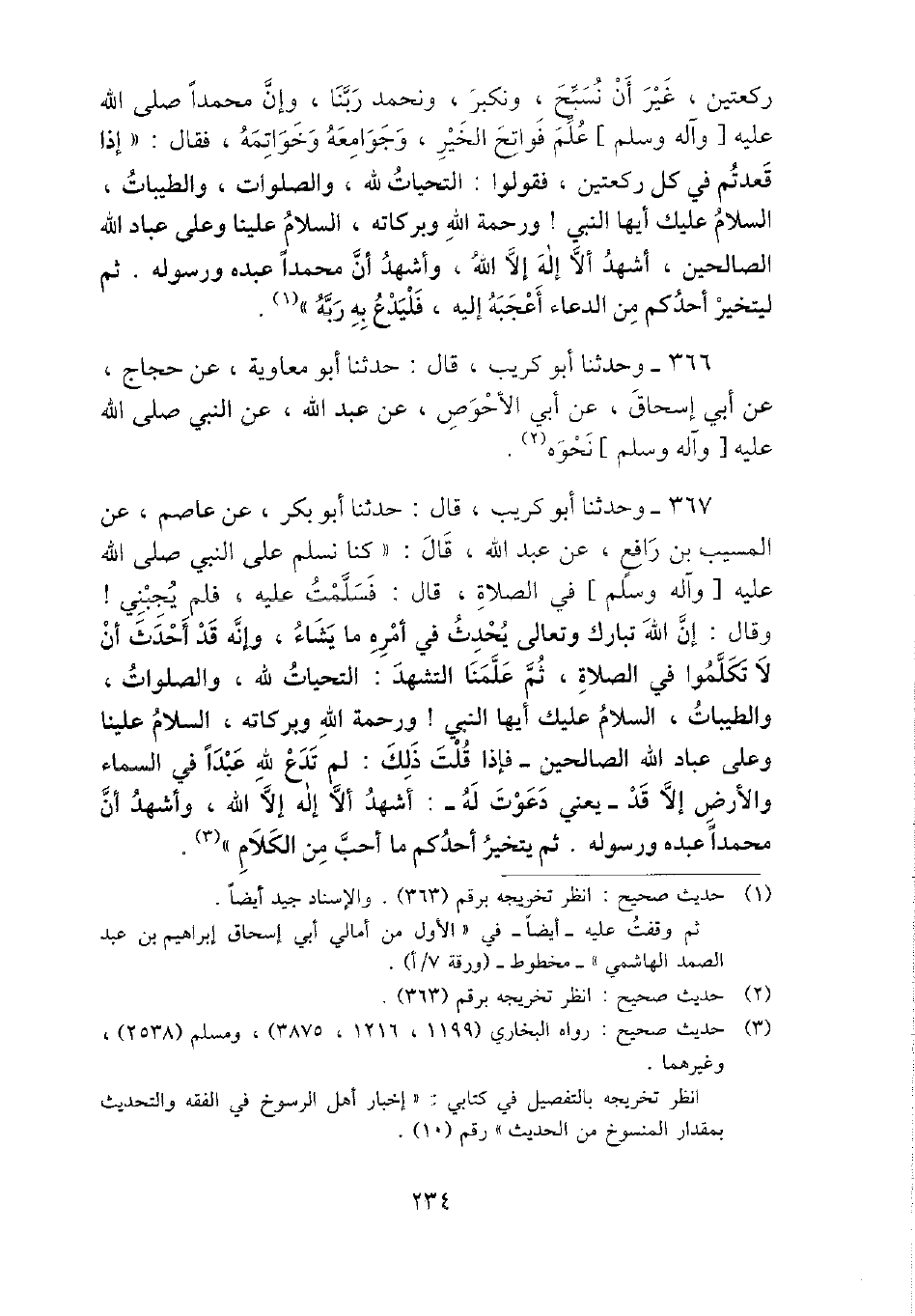 367 - وَحدثنَا أَبُو كريب، قَالَ: حَدثنَا أَبُو بكر، عَن عَاصِم، عَن الْمسيب بن رَافع، عَن عبد الله، قَالَ: " كُنَّا نسلم على النَّبِي - صَلَّى اللَّهُ عَلَيْهِ وَسَلَّم َ - فِي الصَّلَاة، قَالَ: فَسلمت عَلَيْهِ، فَلم يجبني} وَقَالَ: إِن الله تبَارك وَتَعَالَى يحدث فِي أمره مَا يَشَاء، وَإنَّهُ قد أحدث أَن لَا تكلمُوا فِي الصَّلَاة، ثمَّ علمنَا التَّشَهُّد: التَّحِيَّات لله، والصلوات، والطيبات، السَّلَام عَلَيْك أَيهَا النَّبِي! وَرَحْمَة الله وَبَرَكَاته، السَّلَام علينا وعَلى عباد الله الصَّالِحين - فَإِذا قلت ذَلِك: لم تدع لله عبدا فِي السَّمَاء وَالْأَرْض إِلَّا قد - يَعْنِي دَعَوْت لَهُ -: أشهد أَلا إِلَه إِلَّا الله، وَأشْهد أَن مُحَمَّدًا عَبده وَرَسُوله. ثمَّ يتَخَيَّر أحدكُم مَا أحب من الْكَلَام ".