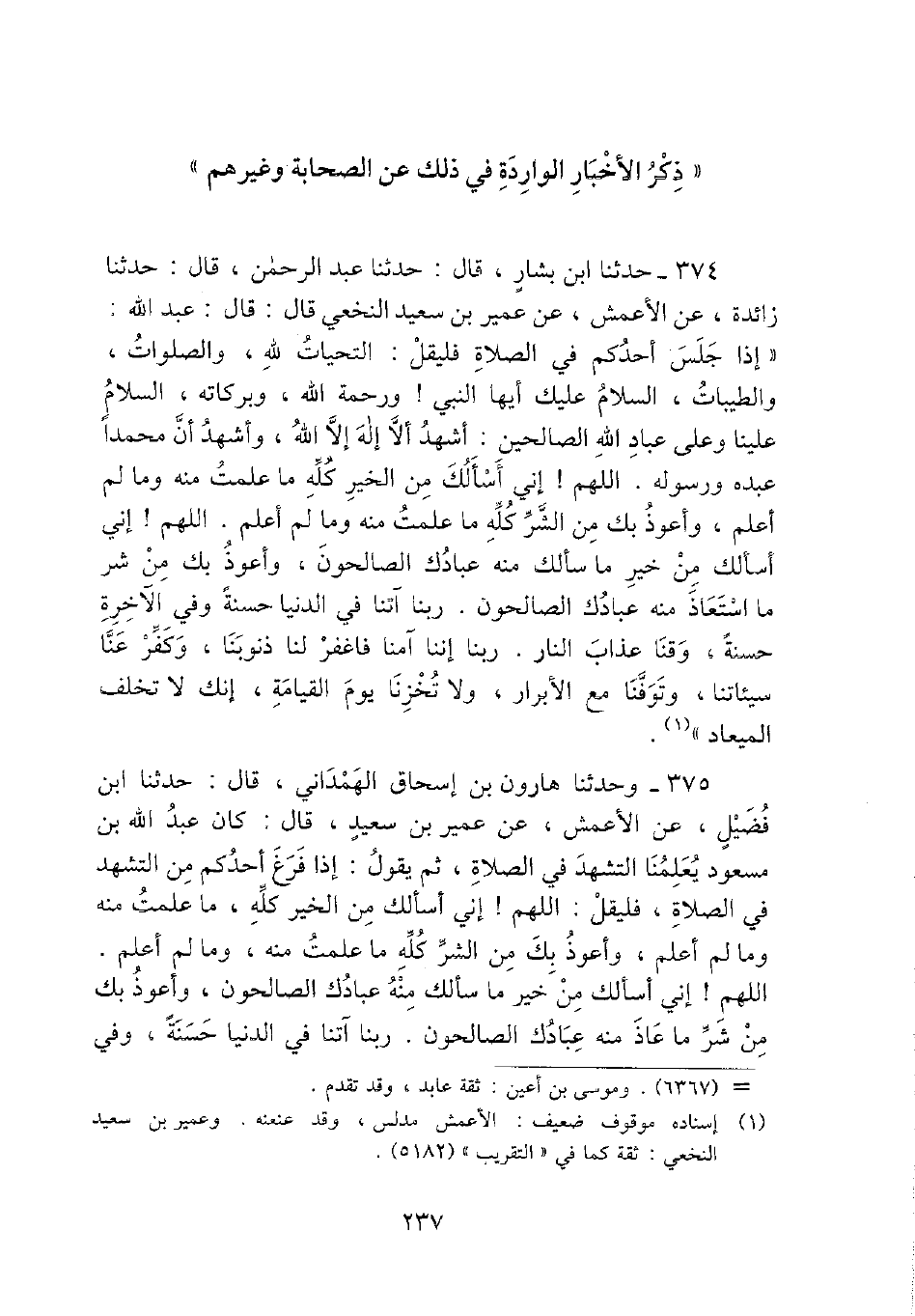 375 - وَحدثنَا هَارُون بن إِسْحَاق الْهَمدَانِي، قَالَ: حَدثنَا ابْن فُضَيْل، عَن الْأَعْمَش، عَن عُمَيْر بن سعيد، قَالَ: كَانَ عبد الله بن مَسْعُود يعلمنَا التَّشَهُّد فِي الصَّلَاة، ثمَّ يَقُول: إِذا فرغ أحدكُم من التَّشَهُّد فِي الصَّلَاة، فَلْيقل: اللَّهُمَّ} إِنِّي أَسأَلك من الْخَيْر كُله، مَا علمت مِنْهُ وَمَا لم أعلم، وَأَعُوذ بك من الشَّرّ كُله مَا علمت مِنْهُ، وَمَا لم أعلم. اللَّهُمَّ! إِنِّي أَسأَلك من خير مَا سَأَلَك مِنْهُ عِبَادك الصالحون، وَأَعُوذ بك من شَرّ مَا عاذ مِنْهُ عِبَادك الصالحون. رَبنَا آتنا فِي الدُّنْيَا حَسَنَة، وَفِي