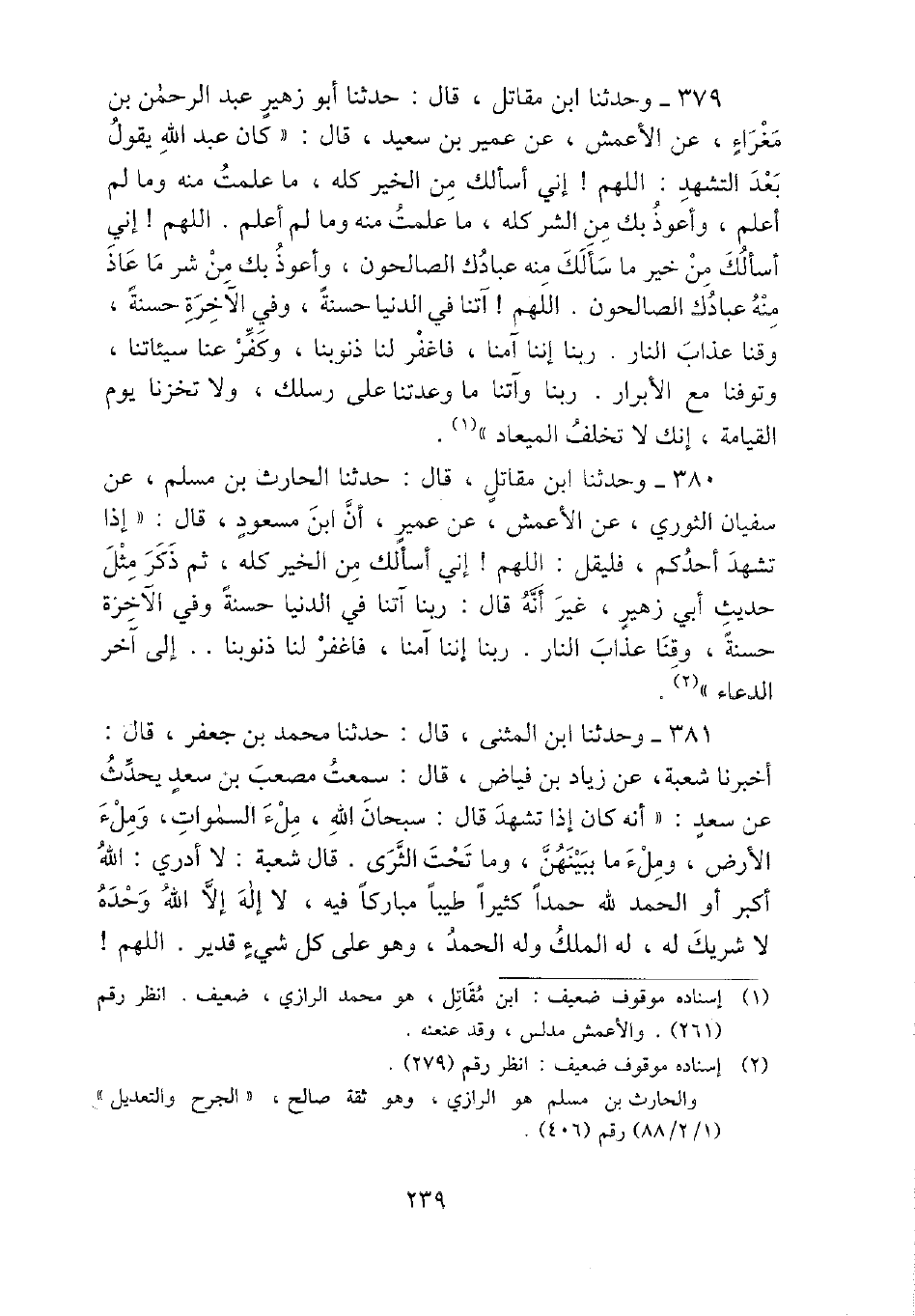 379 - وَحدثنَا ابْن مقَاتل، قَالَ: حَدثنَا أَبُو زُهَيْر عبد الرَّحْمَن بن مغراء، عَن الْأَعْمَش، عَن عُمَيْر بن سعيد، قَالَ: " كَانَ عبد الله يَقُول بعد التَّشَهُّد: اللَّهُمَّ {إِنِّي أَسأَلك من الْخَيْر كُله، مَا علمت مِنْهُ وَمَا لم أعلم، وَأَعُوذ بك من الشَّرّ كُله، مَا علمت مِنْهُ وَمَا لم أعلم. اللَّهُمَّ} إِنِّي أَسأَلك من خير مَا سَأَلَك مِنْهُ عِبَادك الصالحون، وَأَعُوذ بك من شَرّ مَا عاذ مِنْهُ عِبَادك الصالحون. اللَّهُمَّ {آتنا فِي الدُّنْيَا حَسَنَة، وَفِي الْآخِرَة حَسَنَة، وقنا عَذَاب النَّار. رَبنَا إننا آمنا، فَاغْفِر لنا ذنوبنا، وَكفر عَنَّا سيئاتنا، وتوفنا مَعَ الْأَبْرَار. رَبنَا وآتنا مَا وعدتنا على رسلك، وَلَا تخزنا يَوْم الْقِيَامَة، إِنَّك لَا تخلف الميعاد ".