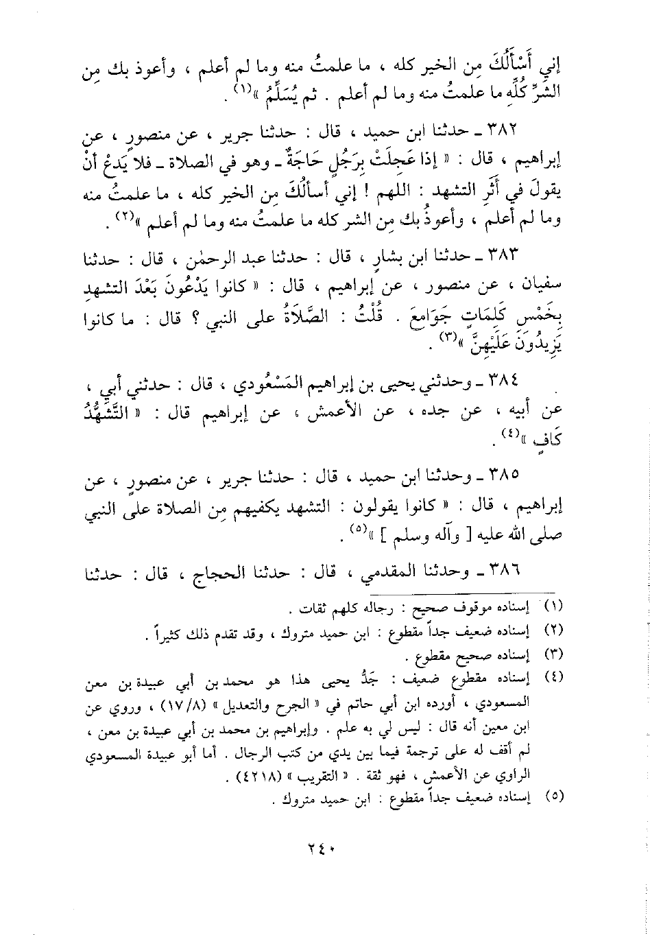 383 - حَدثنَا ابْن بشار، قَالَ: حَدثنَا عبد الرَّحْمَن، قَالَ: حَدثنَا سُفْيَان، عَن مَنْصُور، عَن إِبْرَاهِيم، قَالَ: " كَانُوا يدعونَ بعد التَّشَهُّد بِخمْس كَلِمَات جَوَامِع. قلت: الصَّلَاة على النَّبِي؟ قَالَ: مَا كَانُوا يزِيدُونَ عَلَيْهِنَّ ".