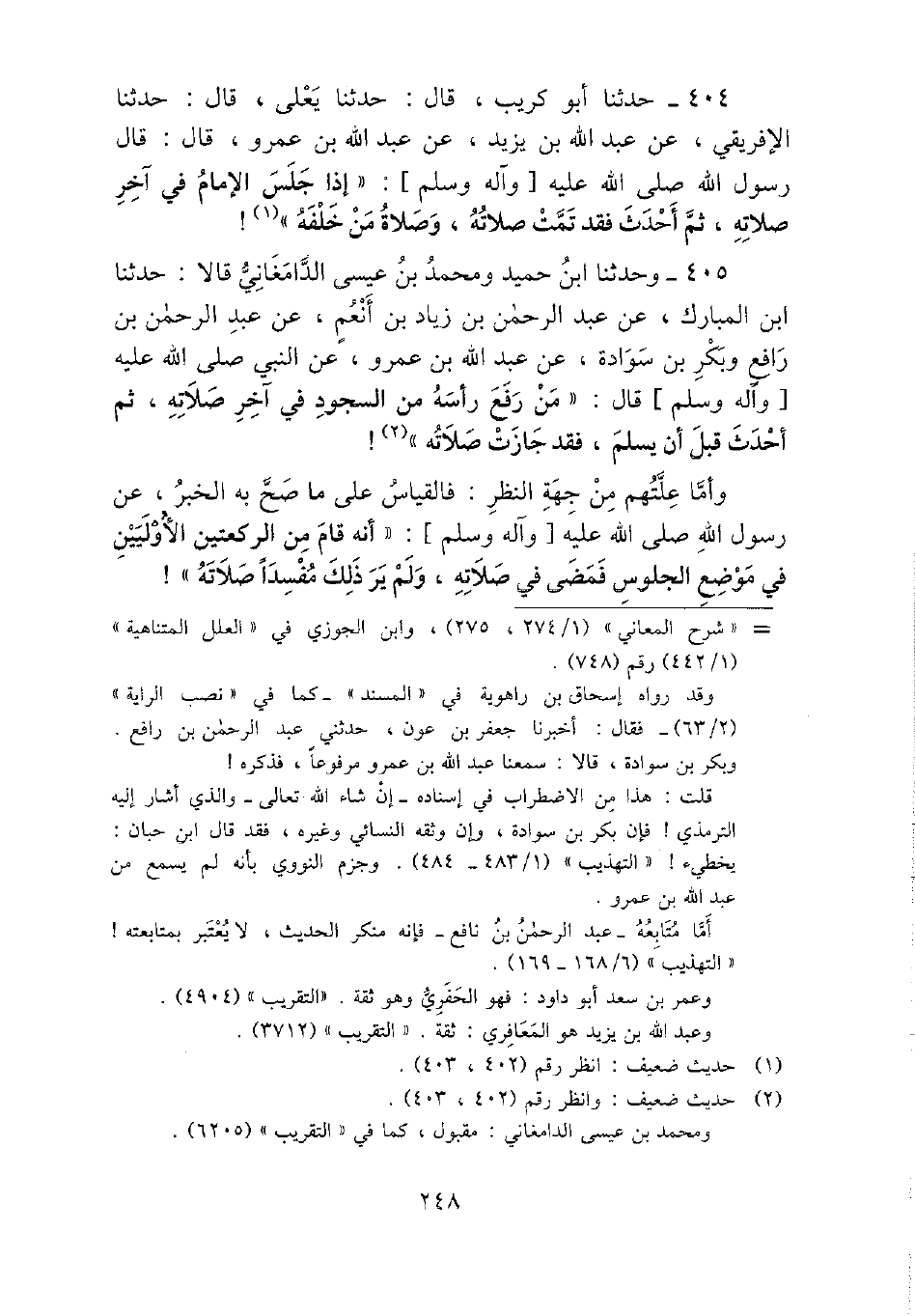 405 - وَحدثنَا ابْن حميد وَمُحَمّد بن عِيسَى الدَّامغَانِي قَالَا: حَدثنَا ابْن الْمُبَارك، عَن عبد الرَّحْمَن بن زِيَاد بن أنعم، عَن عبد الرَّحْمَن بن رَافع وَبكر بن سوَادَة، عَن عبد الله بن عَمْرو، عَن النَّبِي - صَلَّى اللَّهُ عَلَيْهِ وَسَلَّم َ - قَالَ: " من رفع رَأسه من السُّجُود فِي آخر صلَاته، ثمَّ أحدث قبل أَن يسلم، فقد جَازَت صلَاته "}