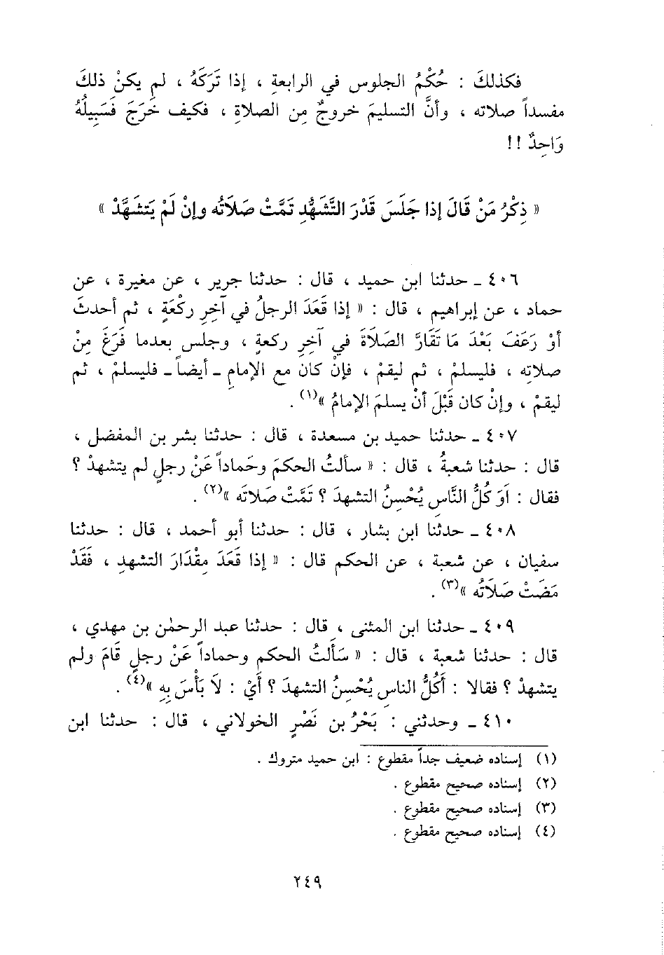 409 - حَدثنَا ابْن الْمثنى، قَالَ: حَدثنَا عبد الرَّحْمَن بن مهْدي، قَالَ: حَدثنَا شُعْبَة، قَالَ: " سَأَلت الحكم وحمادا عَن رجل قَامَ وَلم يتَشَهَّد؟ فَقَالَا: أكل النَّاس يحسن التَّشَهُّد؟ أَي: لَا بَأْس بِهِ ".