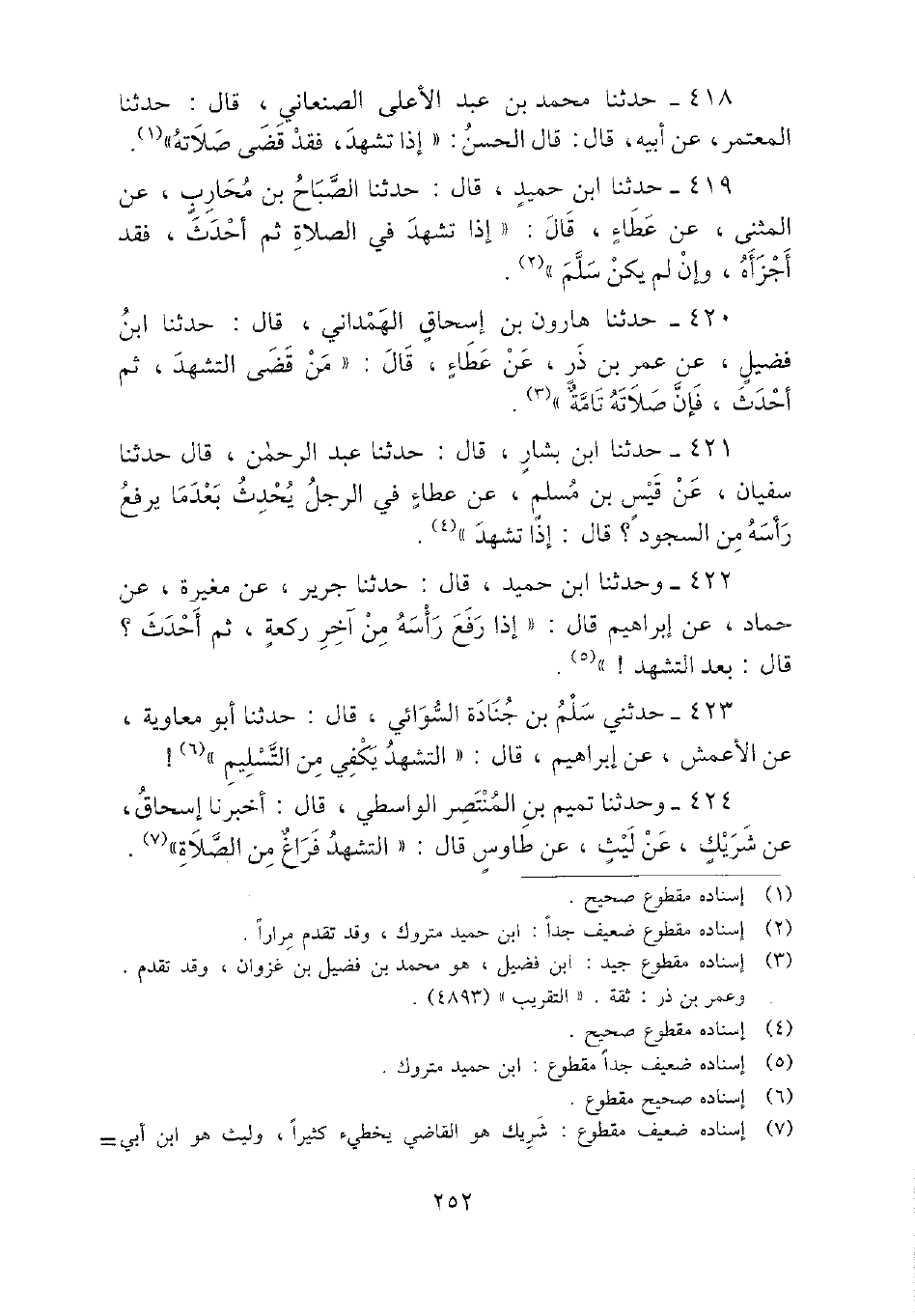 424 - وَحدثنَا تَمِيم بن الْمُنْتَصر الوَاسِطِيّ، قَالَ: أخبرنَا إِسْحَاق، عَن شريك، عَن لَيْث، عَن طَاوس قَالَ: " التَّشَهُّد فرَاغ من الصَّلَاة ".