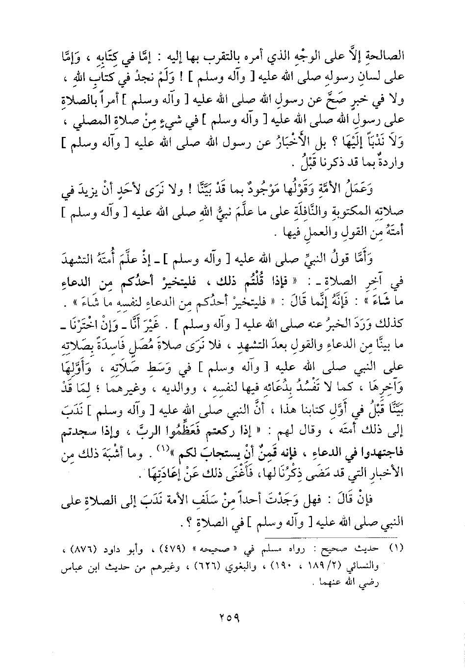 الصَّالِحَة إِلَّا على الْوَجْه الَّذِي أمره بالتقرب بهَا إِلَيْهِ: إِمَّا فِي كِتَابه، وَإِمَّا على لِسَان رَسُوله - صَلَّى اللَّهُ عَلَيْهِ وَسَلَّم َ - وَلم نجد فِي كتاب الله، وَلَا فِي خبر صَحَّ عَن رَسُول الله - صَلَّى اللَّهُ عَلَيْهِ وَسَلَّم َ - أمرا بِالصَّلَاةِ على رَسُول الله - صَلَّى اللَّهُ عَلَيْهِ وَسَلَّم َ - فِي شَيْء من صَلَاة الْمُصَلِّي، وَلَا ندبا إِلَيْهَا؟ بل الْأَخْبَار عَن رَسُول الله - صَلَّى اللَّهُ عَلَيْهِ وَسَلَّم َ - وَارِدَة بِمَا قد ذكرنَا قبل.