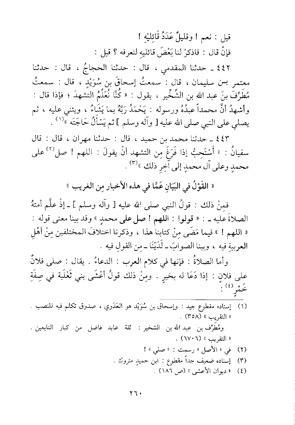 442 - حَدثنَا الْمقدمِي، قَالَ: حَدثنَا الْحجَّاج، قَالَ: حَدثنَا مُعْتَمر بن سُلَيْمَان، قَالَ: سَمِعت إِسْحَاق بن سُوَيْد، قَالَ: سَمِعت مطرف بن عبد الله بن الشخير، يَقُول: " كُنَّا نعلم التَّشَهُّد؛ فَإِذا قَالَ: وَأشْهد أَن مُحَمَّدًا عَبده وَرَسُوله: يحمد ربه بِمَا يَشَاء، ويثني عَلَيْهِ، ثمَّ يُصَلِّي على النَّبِي - صَلَّى اللَّهُ عَلَيْهِ وَسَلَّم َ - ثمَّ يسْأَل حَاجته ".