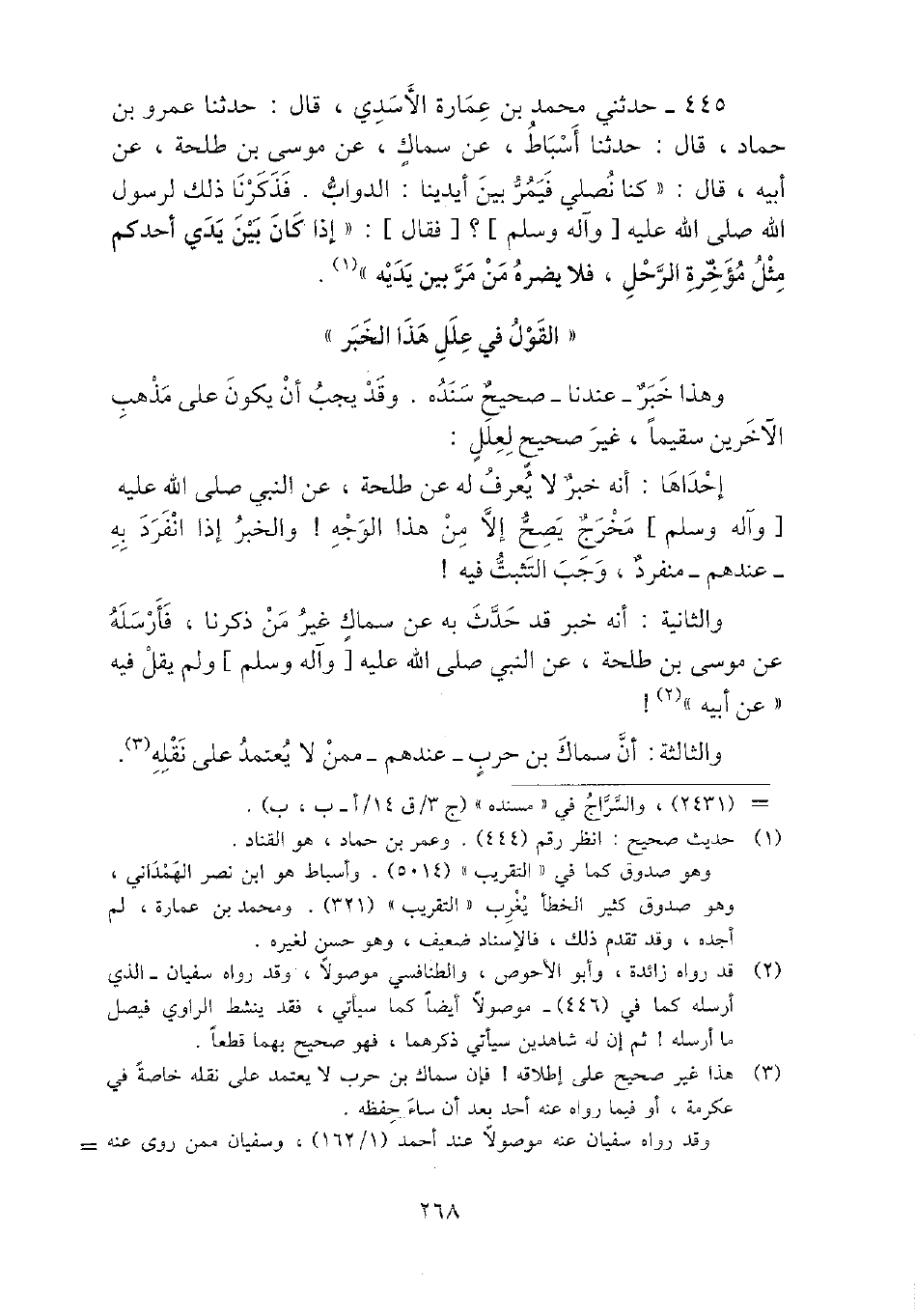 445 - حَدثنِي مُحَمَّد بن عمَارَة الْأَسدي، قَالَ: حَدثنَا عَمْرو بن حَمَّاد، قَالَ: حَدثنَا أَسْبَاط، عَن سماك، عَن مُوسَى بن طَلْحَة، عَن أَبِيه، قَالَ: " كُنَّا نصلي فيمر بَين أَيْدِينَا: الدَّوَابّ. فَذَكرنَا ذَلِك لرَسُول الله - صَلَّى اللَّهُ عَلَيْهِ وَسَلَّم َ -؟ [فَقَالَ] : " إِذا كَانَ بَين يَدي أحدكُم مثل مؤخرة الرحل، فَلَا يضرّهُ من مر بَين يَدَيْهِ ".