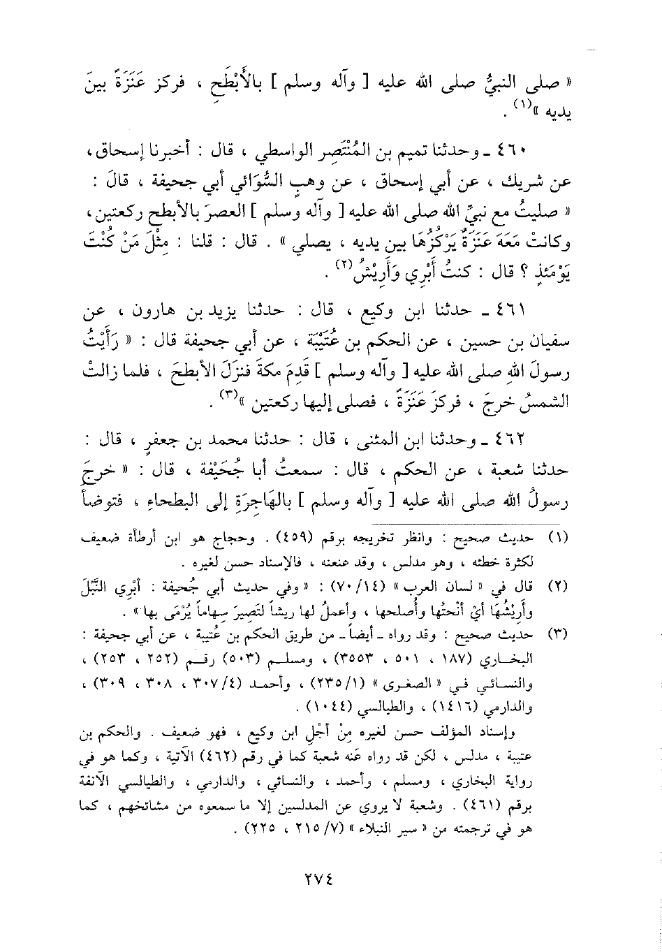 460 - وَحدثنَا تَمِيم بن الْمُنْتَصر الوَاسِطِيّ، قَالَ: أخبرنَا إِسْحَاق، عَن شريك، عَن أبي إِسْحَاق، عَن وهب السوَائِي أبي جُحَيْفَة، قَالَ: " صليت مَعَ نَبِي الله - صَلَّى اللَّهُ عَلَيْهِ وَسَلَّم َ - الْعَصْر بِالْأَبْطح رَكْعَتَيْنِ، وَكَانَت مَعَه عنزة يركزها بَين يَدَيْهِ، يُصَلِّي ". قَالَ: قُلْنَا: مثل من كنت يَوْمئِذٍ؟ قَالَ: كنت أبري وأريش.