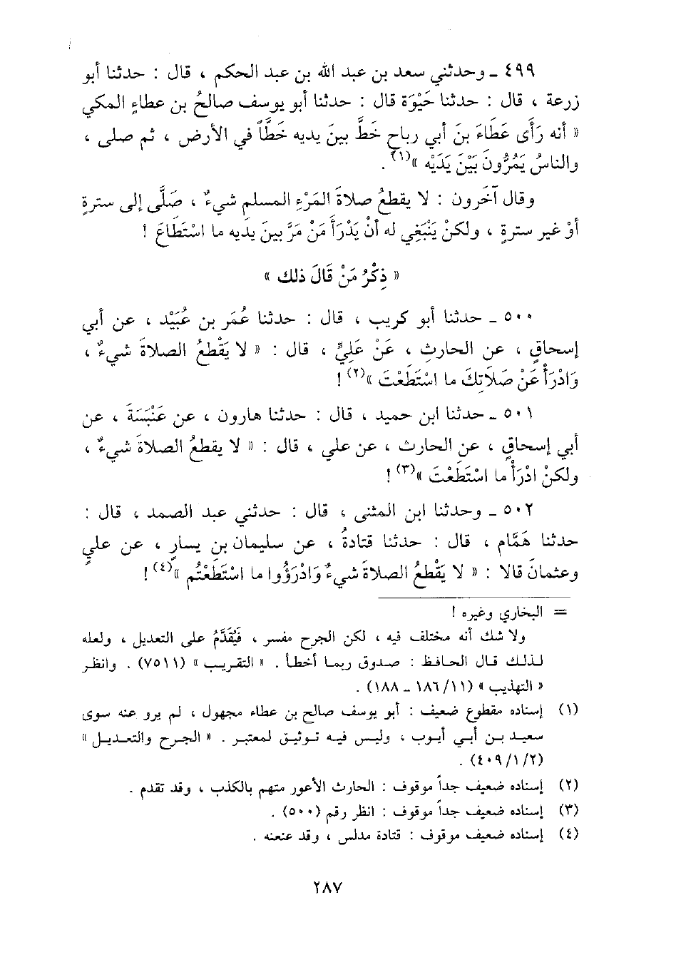499 - وحَدثني سعد بن عبد الله بن عبد الحكم، قَالَ: حَدثنَا أَبُو زرْعَة، قَالَ: حَدثنَا حَيْوَة قَالَ: حَدثنَا أَبُو يُوسُف صَالح بن عَطاء الْمَكِّيّ " أَنه رأى عَطاء بن أبي رَبَاح خطّ بَين يَدَيْهِ خطا فِي الأَرْض، ثمَّ صلى، وَالنَّاس يَمرونَ بَين يَدَيْهِ ".