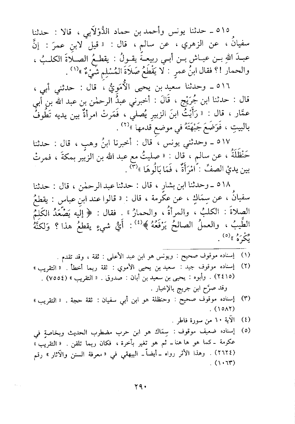 515 - حَدثنَا يُونُس وَأحمد بن حَمَّاد الدولابي، قَالَا: حَدثنَا سُفْيَان، عَن الزُّهْرِيّ، عَن سَالم، قَالَ: " قيل لِابْنِ عمر: إِن عبد الله بن عَيَّاش بن أبي ربيعَة يَقُول: يقطع الصَّلَاة الْكَلْب، وَالْحمار! ؟ فَقَالَ ابْن عمر: لَا يقطع صَلَاة الْمُسلم شَيْء ".