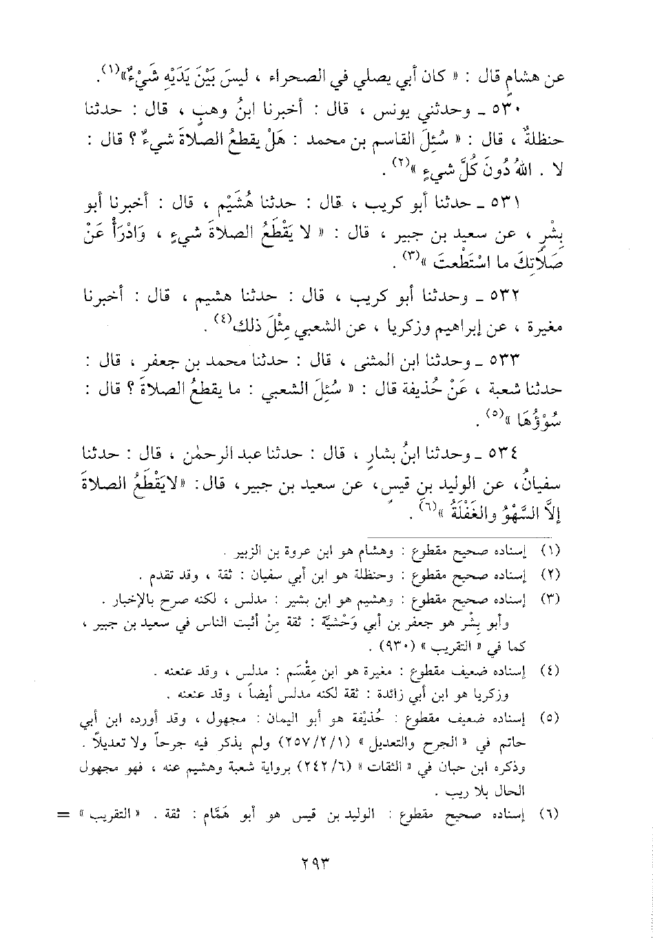 531 - حَدثنَا أَبُو كريب، قَالَ: حَدثنَا هشيم، قَالَ: أخبرنَا أَبُو بشر، عَن سعيد بن جُبَير، قَالَ: " لَا يقطع الصَّلَاة شَيْء، وادرأ عَن صَلَاتك مَا اسْتَطَعْت ".