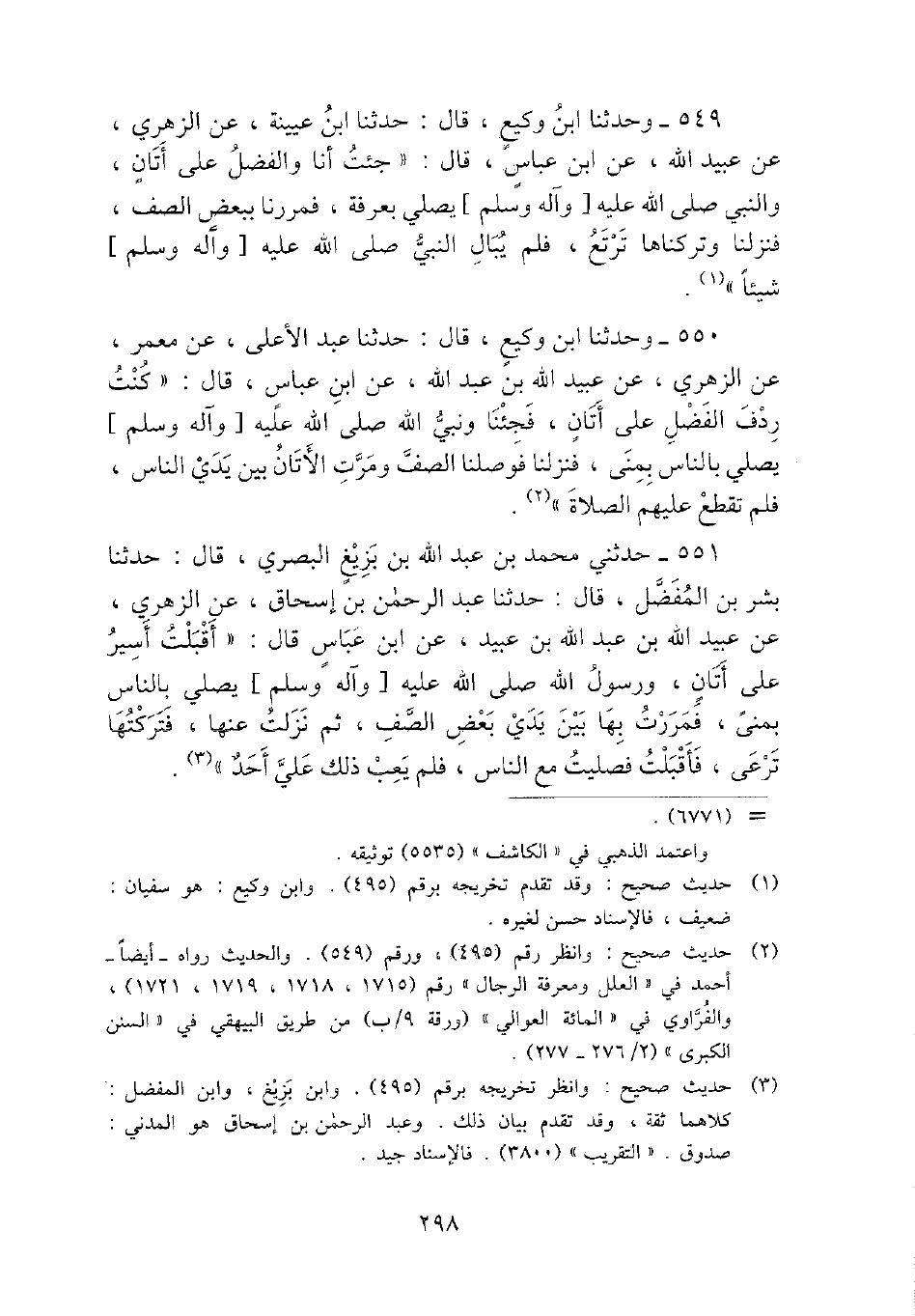 549 - وَحدثنَا ابْن وَكِيع، قَالَ: حَدثنَا ابْن عُيَيْنَة، عَن الزُّهْرِيّ، عَن عبيد الله، عَن ابْن عَبَّاس، قَالَ: " جِئْت أَنا وَالْفضل على أتان، وَالنَّبِيّ - صَلَّى اللَّهُ عَلَيْهِ وَسَلَّم َ - يُصَلِّي بِعَرَفَة، فمررنا بِبَعْض الصَّفّ، فنزلنا وتركناها ترتع، فَلم يبال النَّبِي - صَلَّى اللَّهُ عَلَيْهِ وَسَلَّم َ - شَيْئا ".